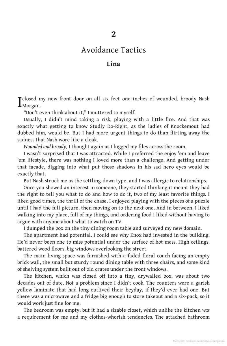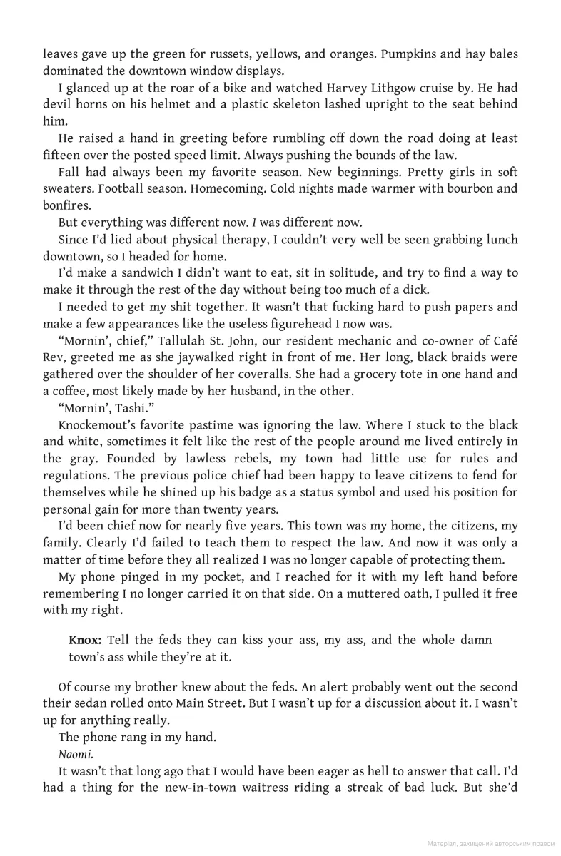 Lina is on a mission. As soon as she gets what she's after, she has no intention of sticking around. The town of Knockemout has other ideas. Soon she finds herself sucked into small-town life. Dog-sitting. Saying yes to a bridesmaid's dress. Listening to the sexy chief of police in the shower.
