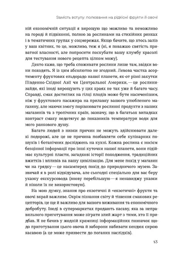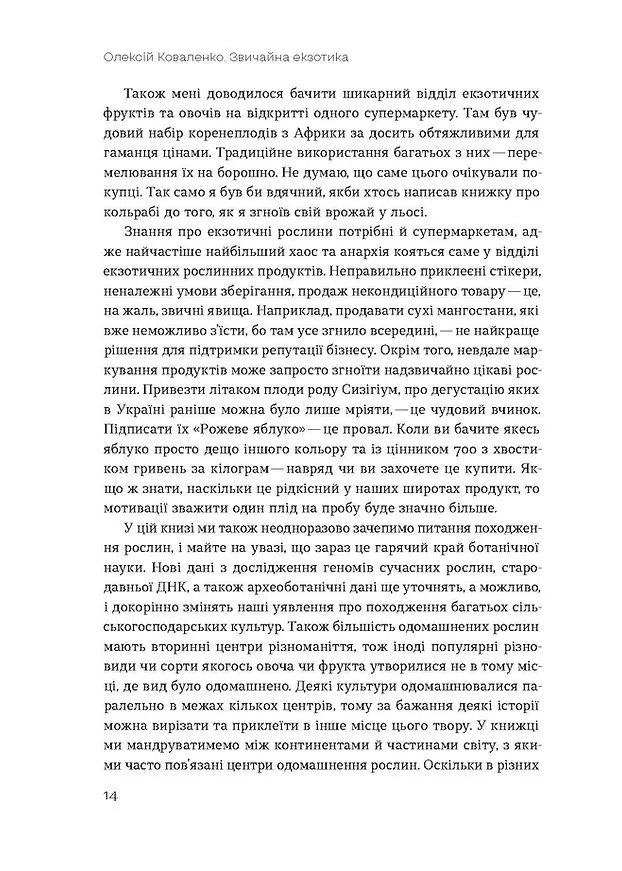 Абсолютна більшість рослин, які оточують нас на городах і в садках, — це чужинці, до яких ми звикли, яких полюбили та вважаємо своїми. Така сама ситуація коїться і в наших холодильниках. Нова книжка ботаніка Олексія Коваленка знайомить нас зі світом через фрукти та овочі: від анісу, інжиру й дині до базиліку, ківі та лічі, від Середземномор'я й Китаю до Австралії, Аргентини та Канади. Олексій розповідає, чому деякі люди настільки ненавидять запах кінзи і як зробити вино з пастернаку, пояснює, як були одомашнені певні види рослин та як вони потрапили в наш город і на стіл.