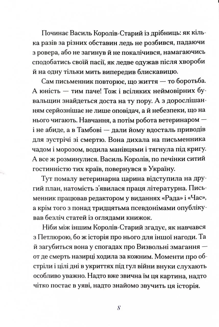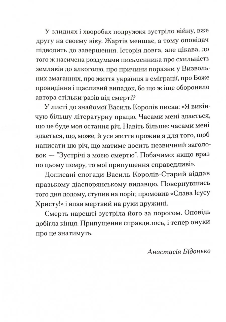 Василь Королів-Старий зміг виїхати в еміграцію і так врятувався від долі своїх репресованих сучасників. Крім того, він заохотив свою дружину Наталену Королеву до творчості, й потім вона навіть перевершила чоловіка у впізнаваності. В еміграції він працював на благо України до останнього подиху, але у спогадах обрав висвітлити не це.