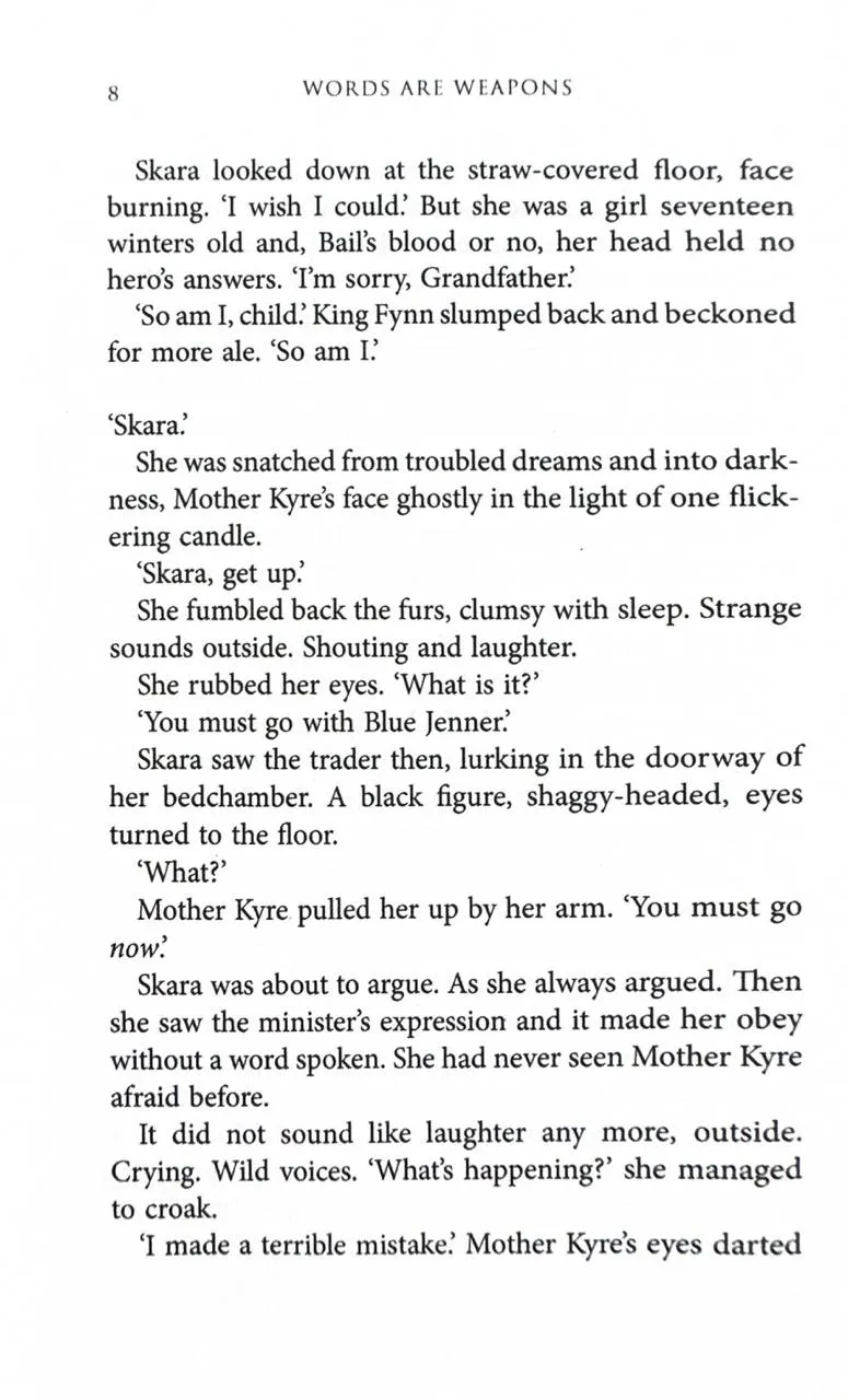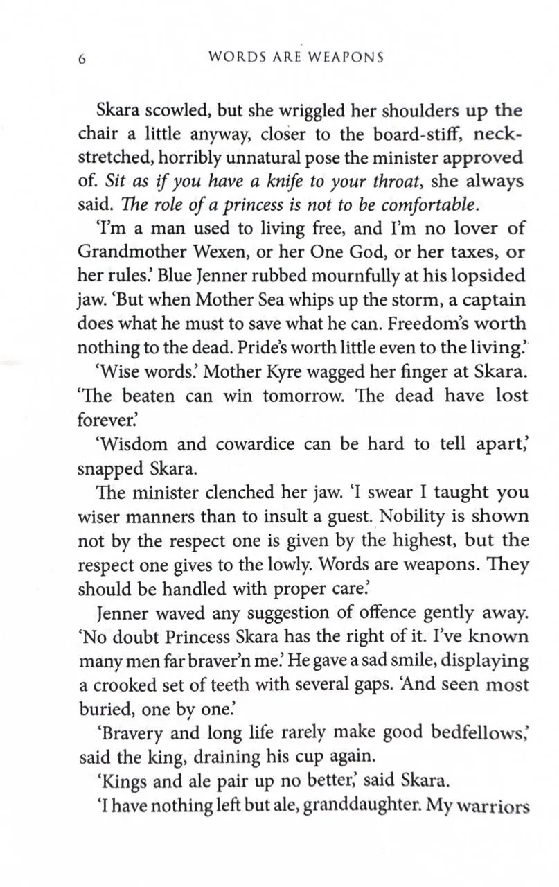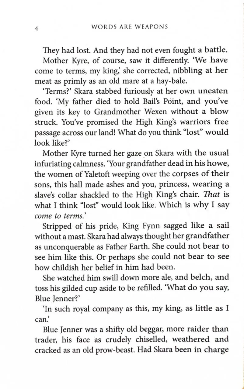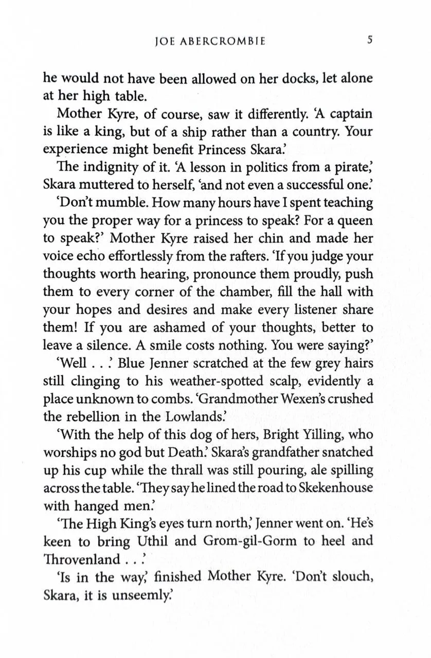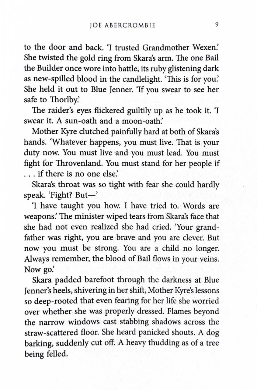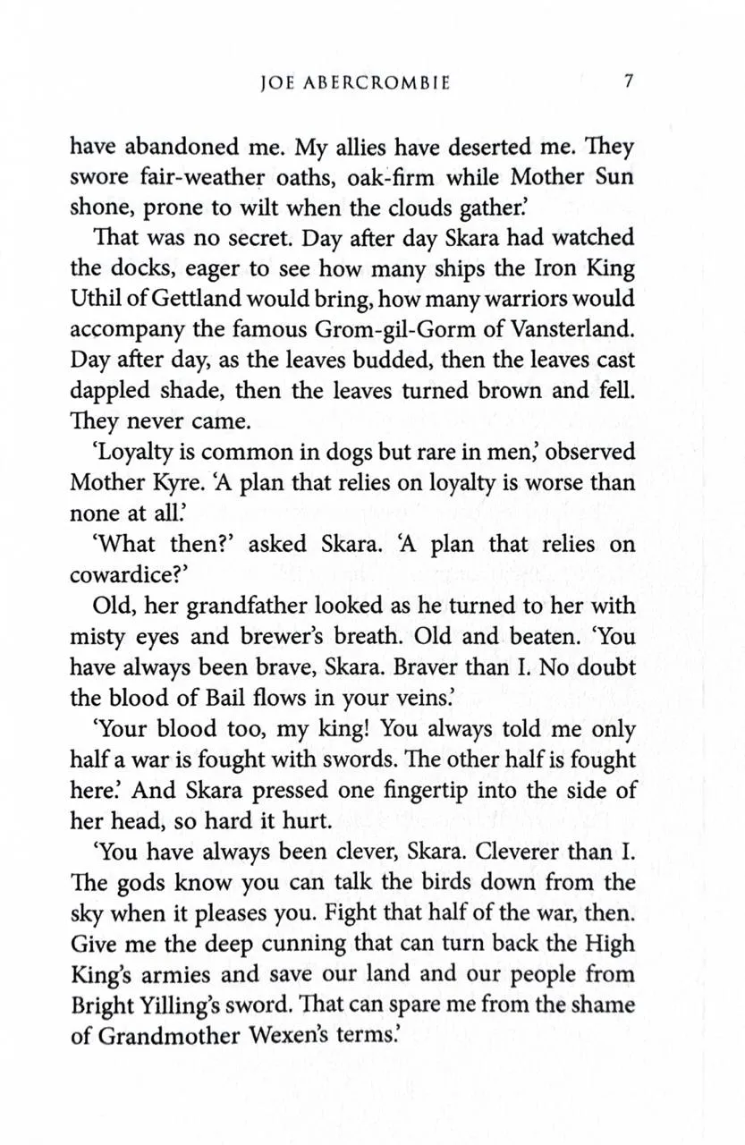 Words are weapons.Princess Skara has seen all she loved made blood and ashes. She is left with only words. But the right words can be as deadly as any blade. If she is to reclaim her birthright, she must conquer her fears and sharpen her wits to a lethal edge.Only half a war is fought with swords.The deeply cunning Father Yarvi has walked a long road from crippled slave to king’s minister. He has made allies of old foes and stitched together an uneasy peace. But now the ruthless Grandmother Wexen has raised the greatest army since the elves made war on God, and put Bright Yilling at its head—a man who worships only Death.Sometimes one must fight evil with evil.Some—like Thorn Bathu and the sword-bearer Raith—are born to fight, perhaps to die. Others—like Brand the smith and Koll the wood-carver—would rather stand in the light. But when Mother War spreads her irons wings, she may cast the whole Shattered Sea into darkness.