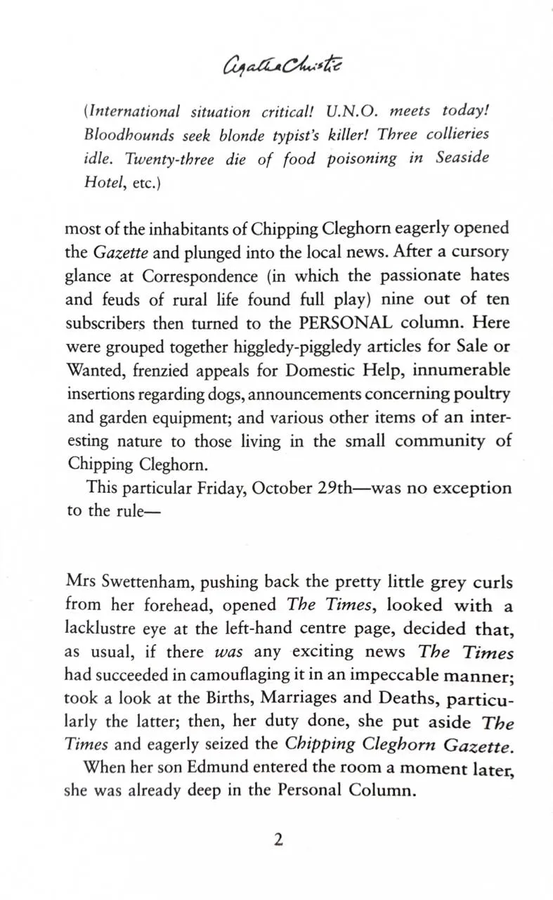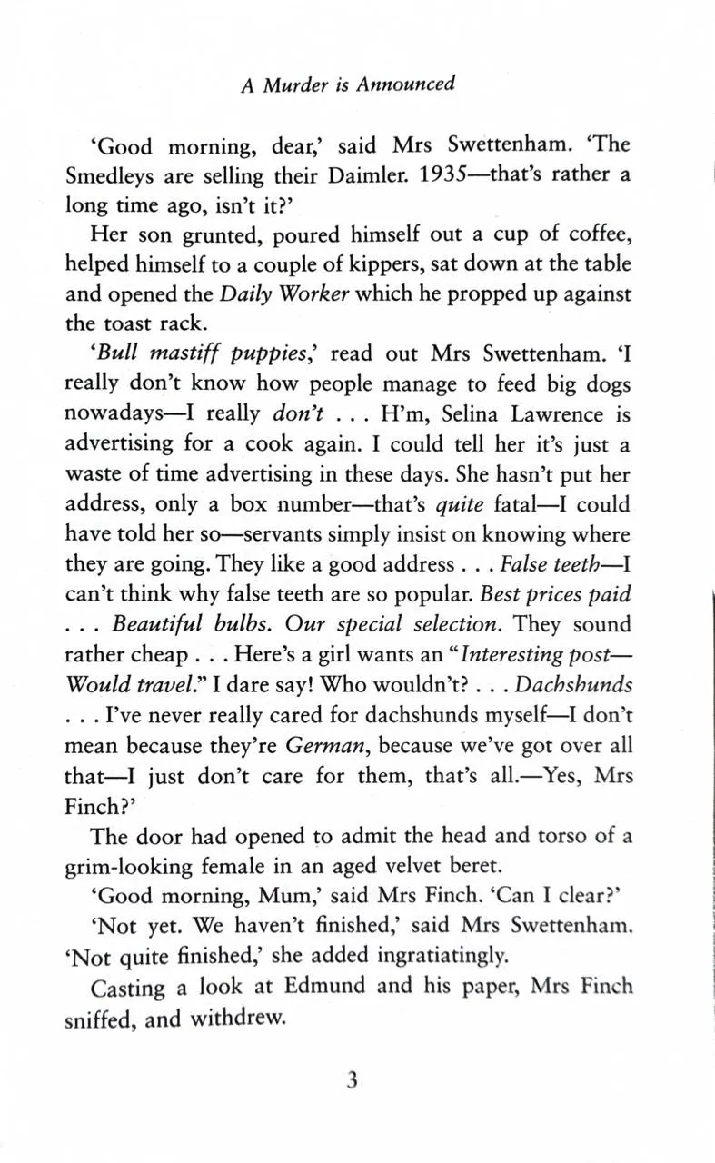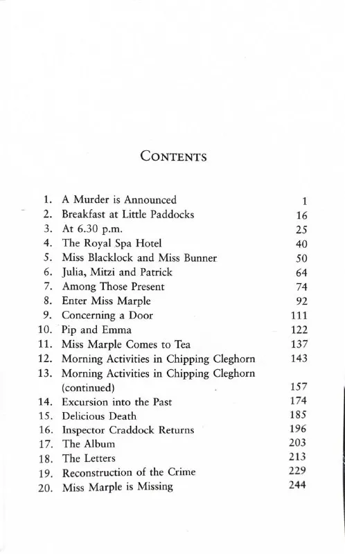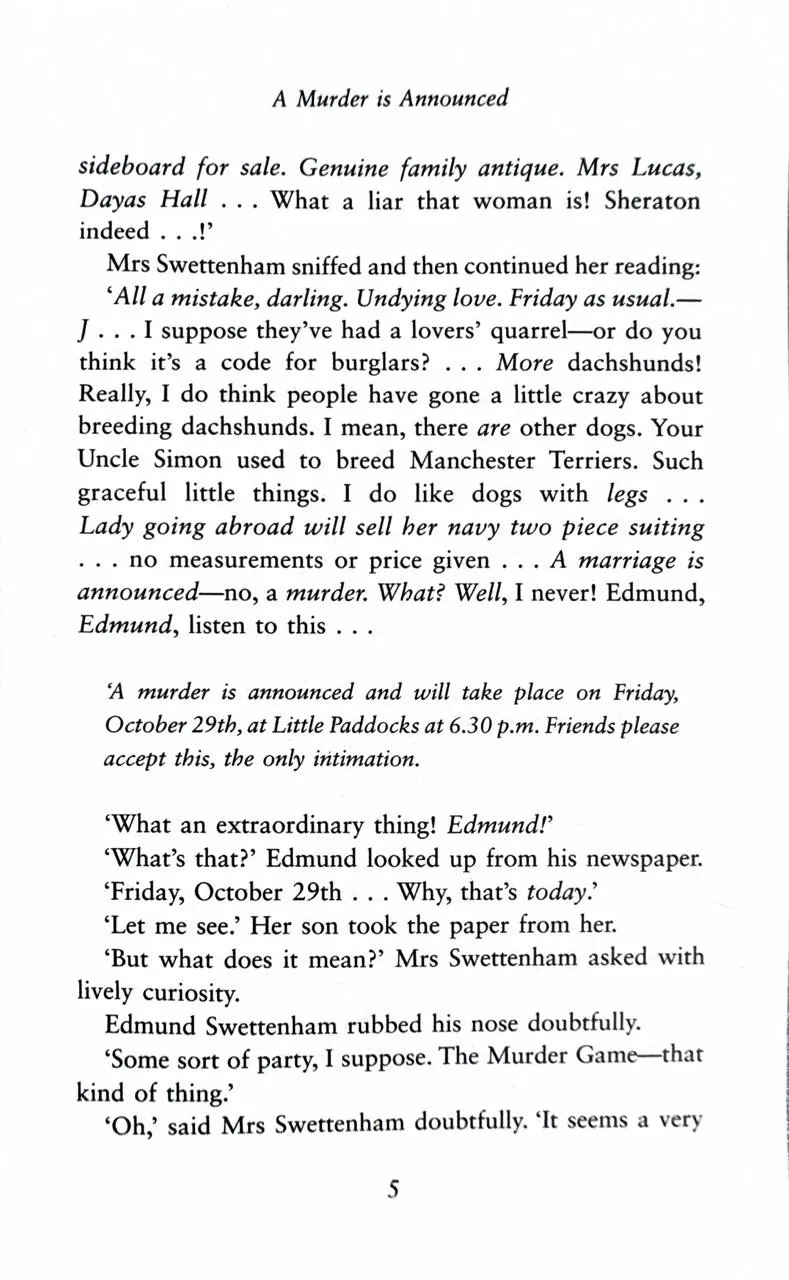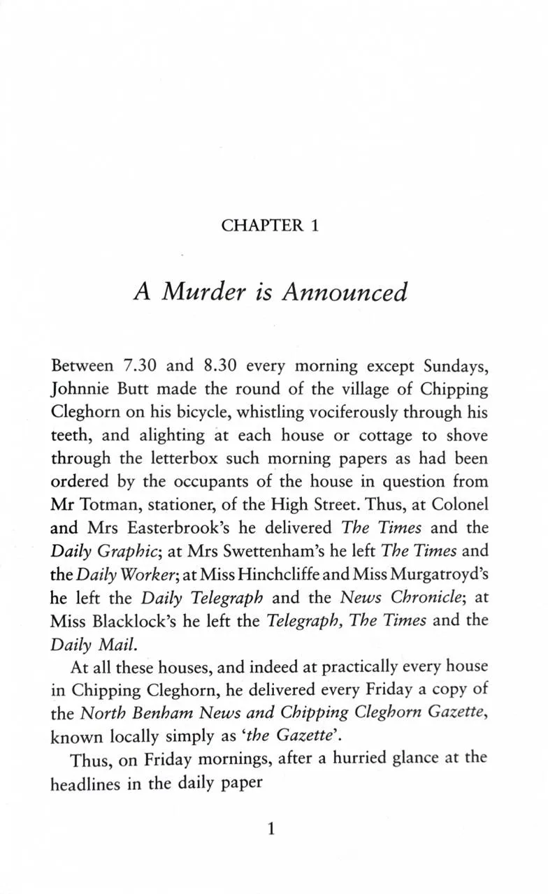 An ordinary villageA shocking announcement One morning the villagers of Chipping Cleghorn wake to find a strange notice in their papers:‘A murder is announced and will take place on Friday, October 29th, at Little Paddocks at 6.30pm.’Suspecting this is just a joke, they gather for some evening entertainment.Then a gunshot is heard.In desperation, the police turn to an old lady whose hobbies are gardening, gossiping – and solving murders.After all, old ladies know better than anyone exactly what goes on in quiet English villages…Never underestimate Miss Marple.