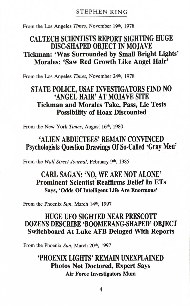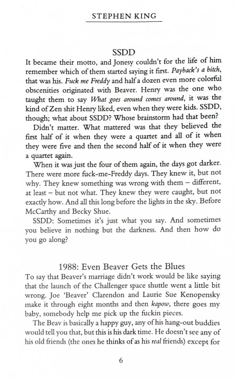 A quarter of a century later, the boys are men who have gone their separate ways. Though they still get together once a year, to go hunting in the north woods of Maine. But this time is different. This time a man comes stumbling into their camp, lost, disoriented and muttering about lights in the sky.