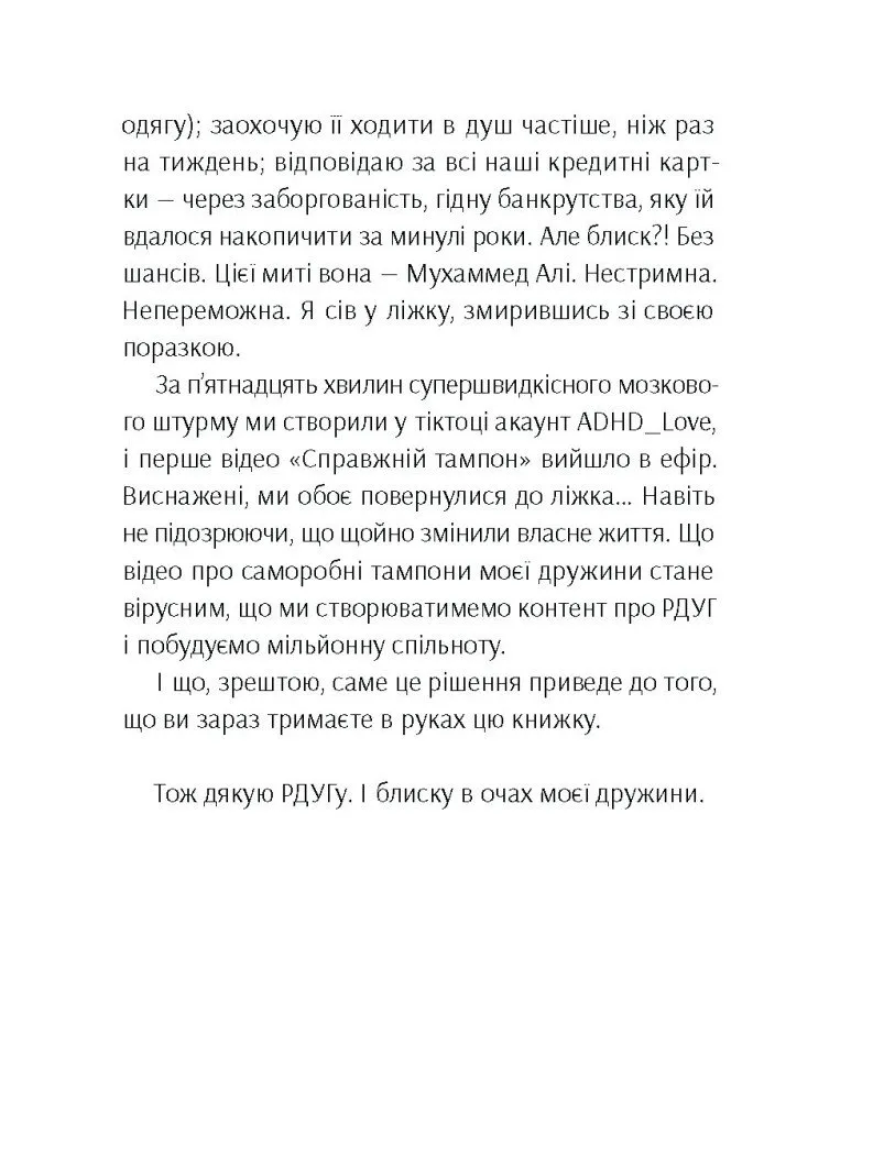 Вам важко давати раду домашнім справам, ви постійно забуваєте зателефонувати рідним, хоч досконало пам’ятаєте всі імена улюблених персонажів фільму? Не можете довго зосередитися ні на чому або раптово фокусуєтесь так, що забуваєте й поїсти? А ще вам страшенно соромно, що звичні для інших речі вам коштують шалених зусиль? Людей із розладом дефіциту уваги з гіперактивністю (РДУГ) досі називають неорганізованими холериками чи лінивими геніями. Автори цієї книжки, тікток-інфлюенсери Річ і Рокс, розповідають про щоденні виклики людей із РДУГ і їхніх близьких. На прикладі власного життя вони у легкій манері діляться порадами, як не втрапити у пастку самозасудження і жити на повну попри всі перешкоди буденності.