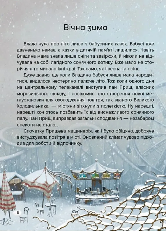 У місті вічної зими мерзнуть цілі родини. Замість свободи тут — диктатура, яка використовує наче зброю Великий Холодильник. Його творець пан Прищ тримає безліч секретів за високими стінами. Маленькій дівчинці Владі доведеться розтаємничити їх усі, аби принести бодай жменьку тепла для рідної мами та врятувати місто.Попри великий холод, казка зігріє вірою в те, що перемагає передовсім любов. Бо ж маленька Влада знає, що найголовніше — не переставати боротися й не замерзнути серцем.