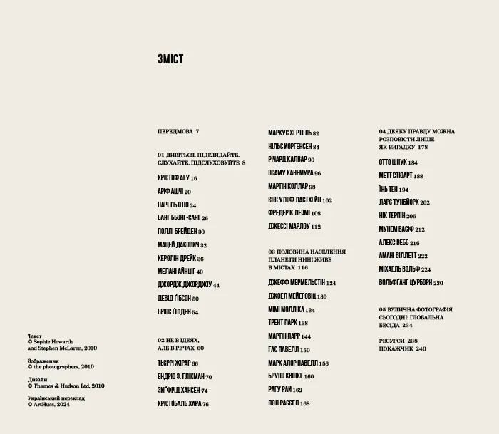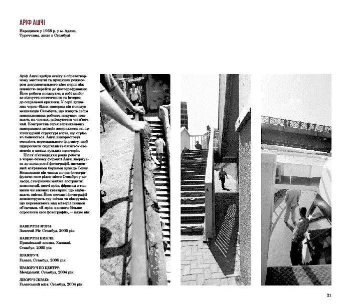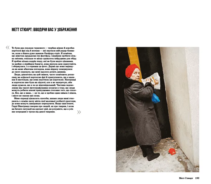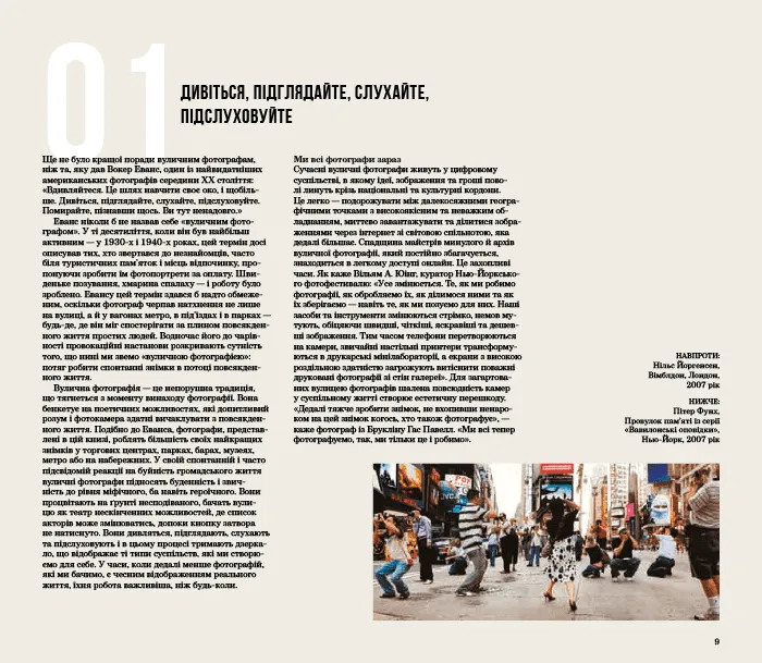 Наблизьтеся до світу вуличної фотографії. Ця книга зібрала 43 сучасних митців, які не втомлюються документувати повсякденність під різними кутами. Серед них — видатні майстри, члени Magnum, як-от: Брюс Ґілден, Мартін Парр, Алекс Вебб, а також інші фотографи з різних країн, кожен з яких презентує унікальне бачення світу. У книзі ви побачите есеї про стиль і філософію митців, їхні розповіді про створення відомих світлин, а також діалог між ними, про найнагальніші проблеми професії. А доповнює ці розповіді 301 кольорова фотографія.