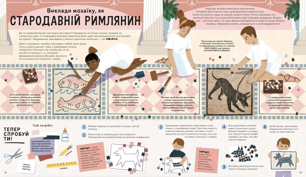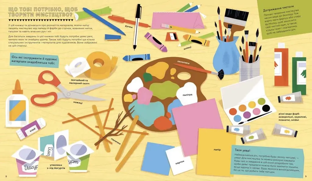 Ця книжка не лише познайомить тебе з митцями минулого й сьогодення з різних країн світу, а й дасть змогу вивчати мистецтво, опановуючи його власноруч. Ти перебуваєш за крок до того, щоб пізнати таємниці створення великого мистецтва з допомогою різних технік. Можливо, деякі з них тобі вже відомі, як-от: рисунок і живопис, але ти можеш спробувати деякі новітні техніки вперше.