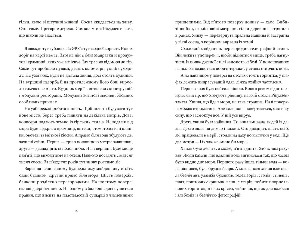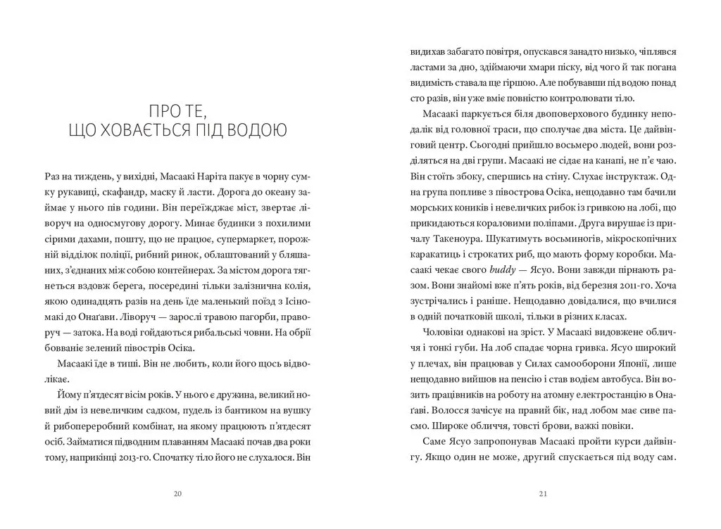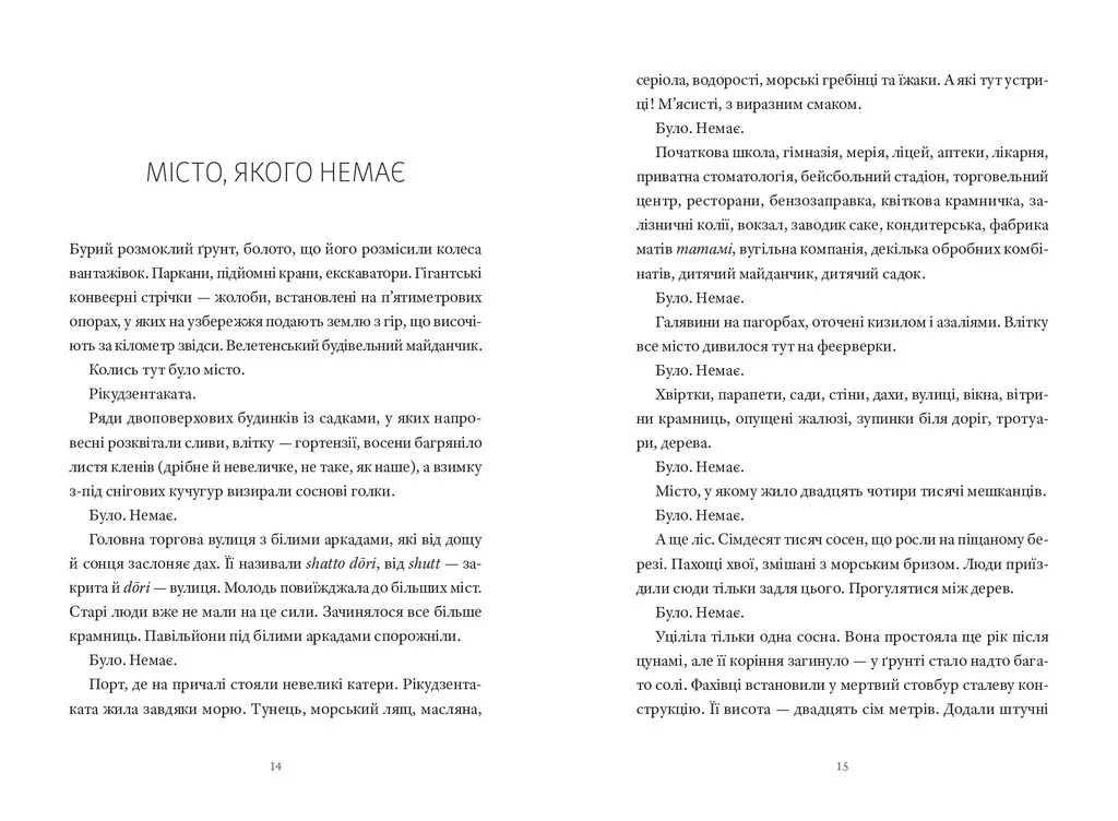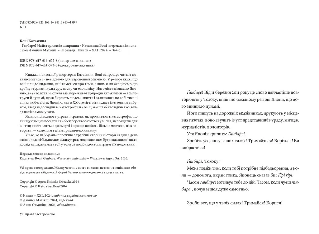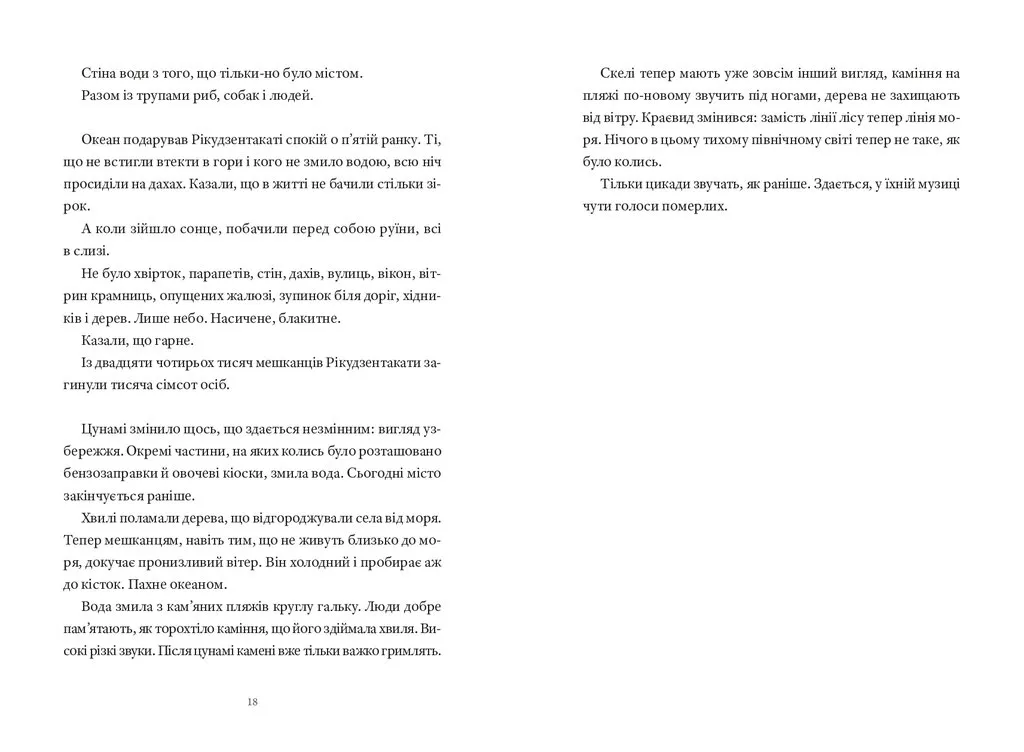 Книжка польської репортерки Катажини Боні запрошує читача познайомитись із невідомою для європейців Японією. У репортажах, що ввійшли до видання, не йтиметься про теми, з якими ми асоціюємо цю країну: туризм, культуру, науку чи економіку. Натомість пізнаємо Японію, яка століття за століттям переживає природні катаклізми — землетруси й цунамі, що забирають людські життя і залишають по собі тисячі зниклих безвісти. Японію, яка в ХХ столітті зіткнулась із атомним вибухом, а відтак досвідчила катастрофи на АЕС, масштаб наслідків якої влада воліє замовчувати. Як японці долають утрати і травми, як проживають катастрофи, що знищують цілі поселення або ж перетворюють їх у місця, непридатні для життя; як ставляться до смерті і про що воліють більше мовчати, ніж говорити, — саме цим темам присвячено книжку. У час, коли Україна переживає трагічні сторінки історії і з дня в день зазнає дедалі більше людських утрат, можливо, нам буде важливо пізнати досвід нації, яка має свої, у чомусь подібні досвіди травм і їх подолання.