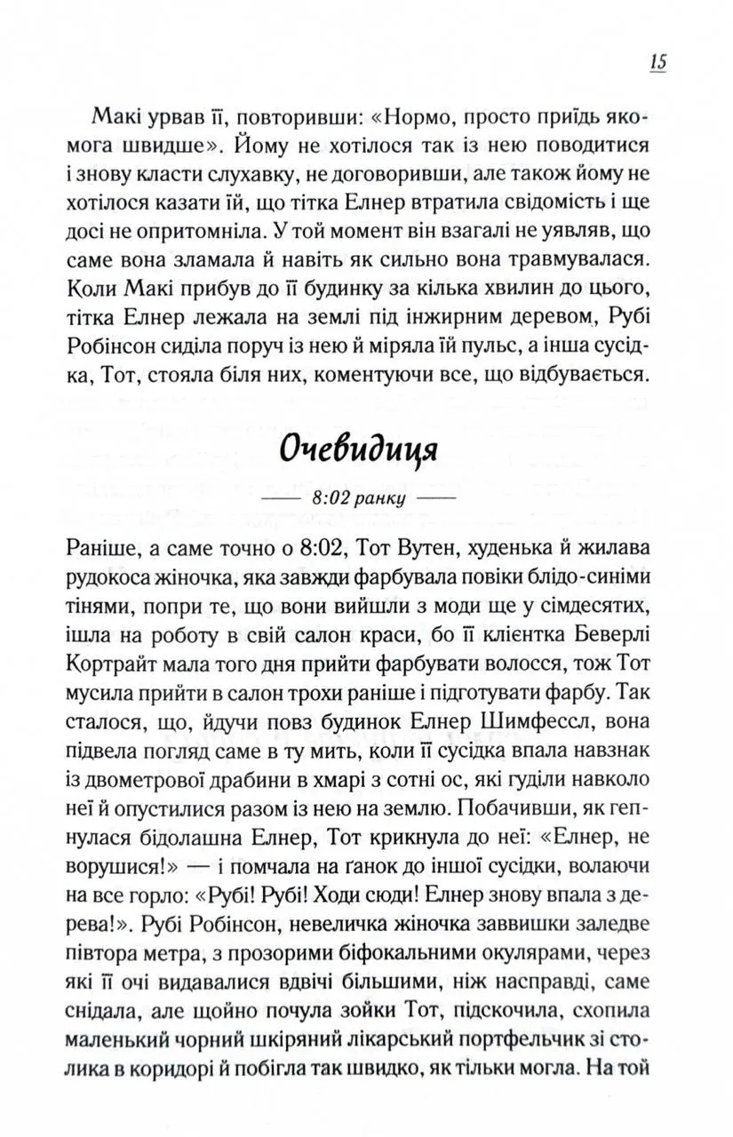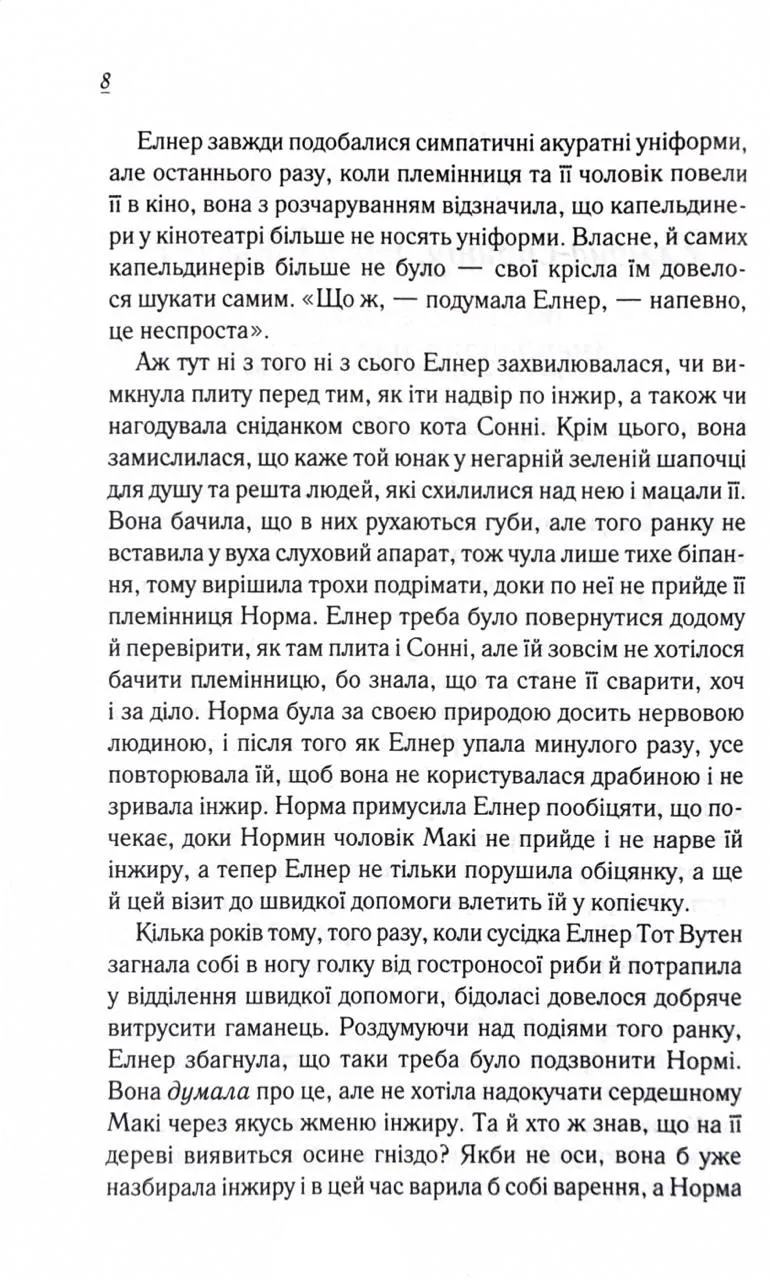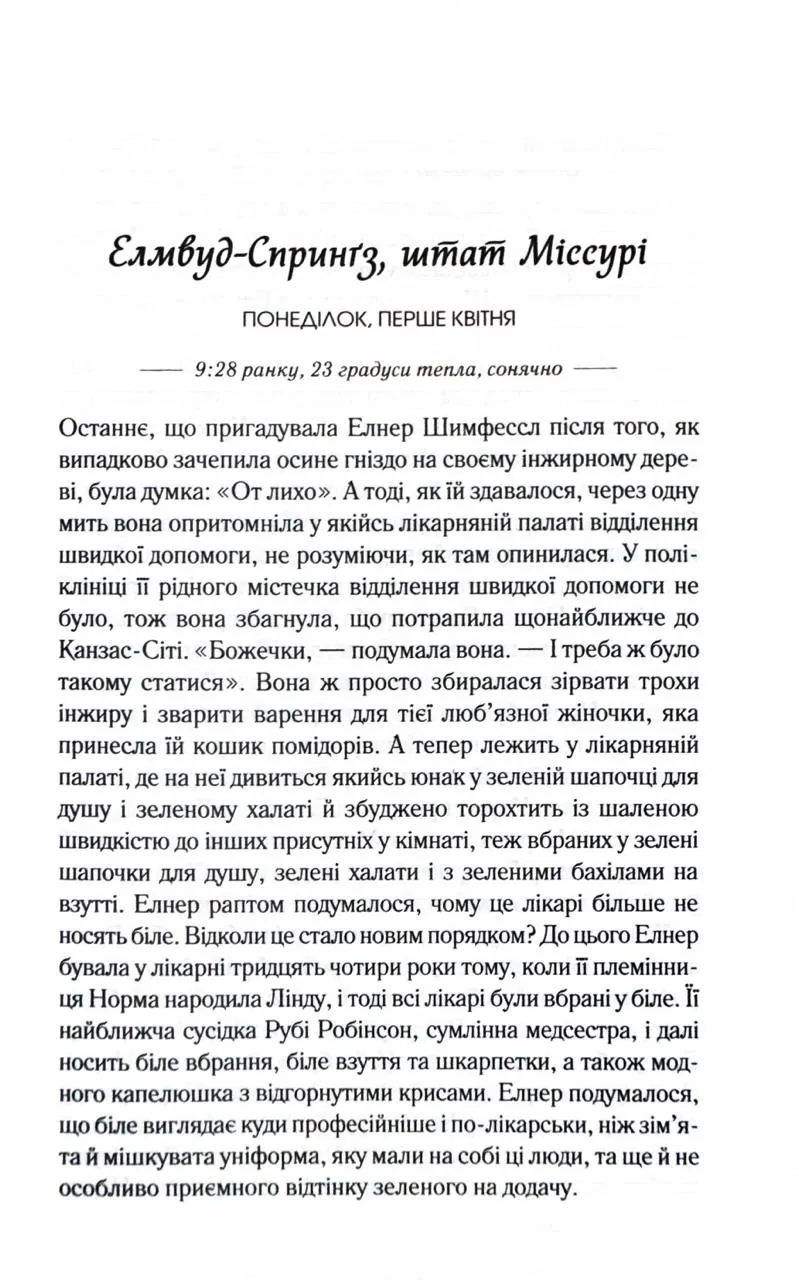 епла та життєствердна історія, яка занурює читачів у маленьке містечко, де кожен день може стати поворотним моментом у житті.Головна героїня, Елнер Шимфессл, усього за кілька хвилин проходить шлях від буденної діяльності — збору інжиру — до непередбачуваної пригоди. Втративши свідомість, вона вирушає у подорож, яка змушує її задуматися про життя і його справжню цінність. У цей час місто теж хвилюється: її племінниця Норма відчуває сильний стрес, сусідка звертається до Біблії за підтримкою, а близький друг Лютер стикається з нещастям на дорозі.Кожен мешканець міста ставить перед собою важливі питання про сенс існування, намагаючись знайти відповіді в хаосі буденності. Ця історія захоплює щирістю та зворушливими моментами, нагадуючи про крихкість людського життя й значення любові та взаємопідтримки.