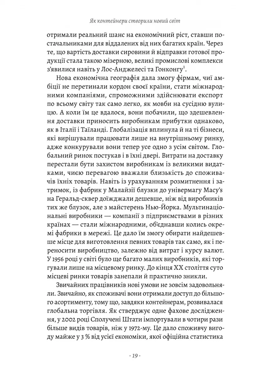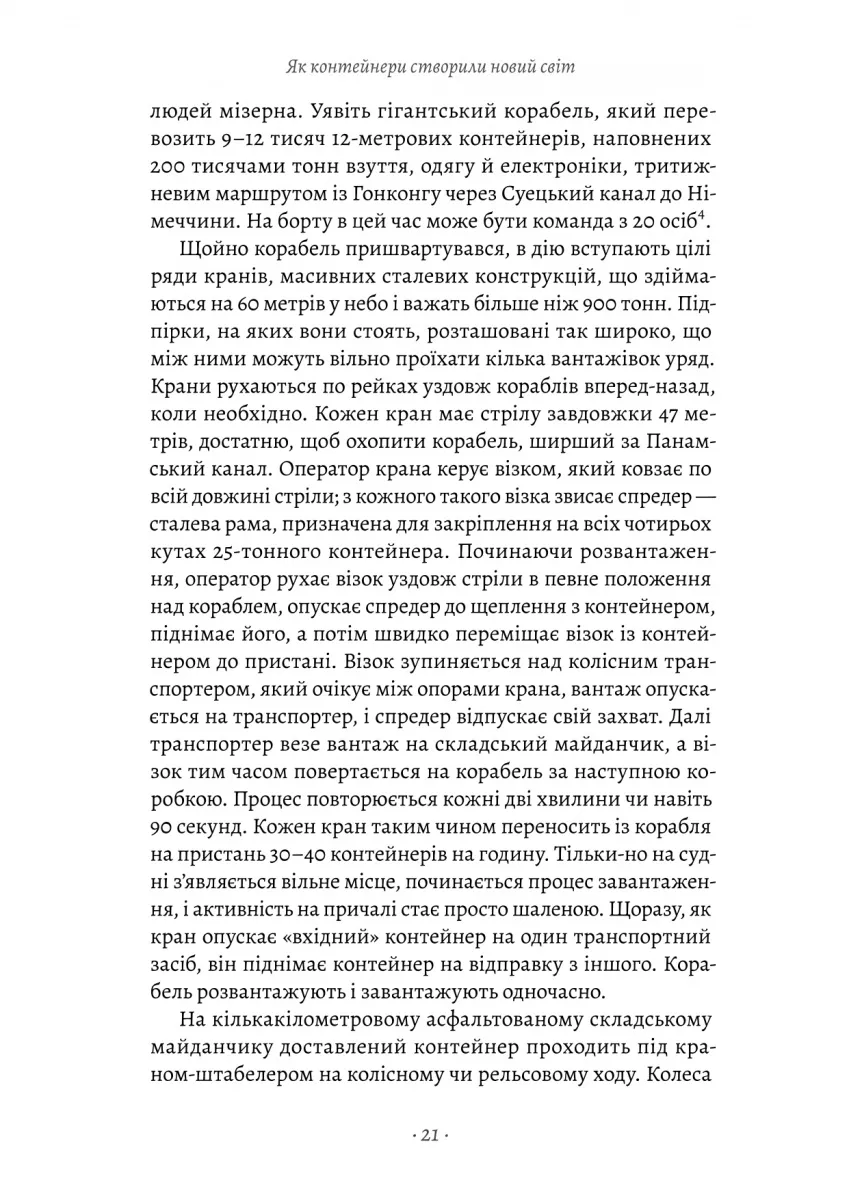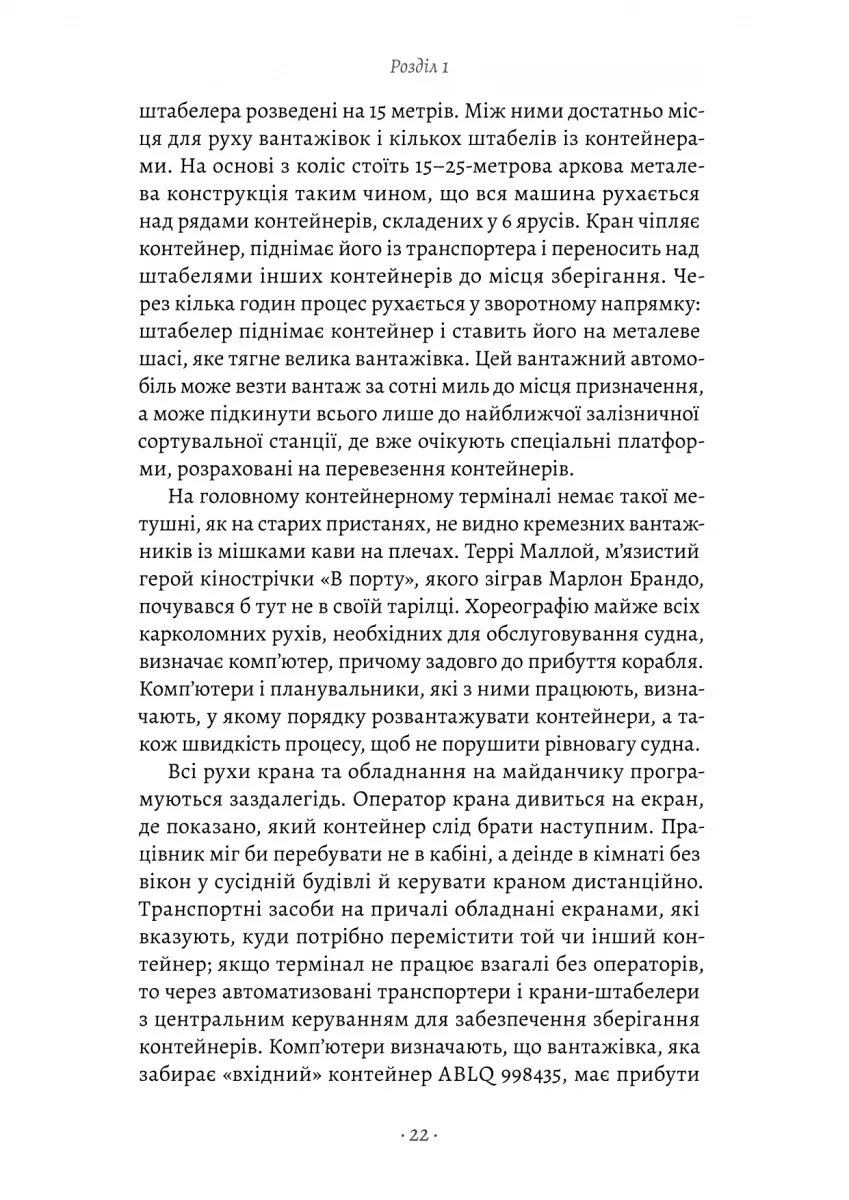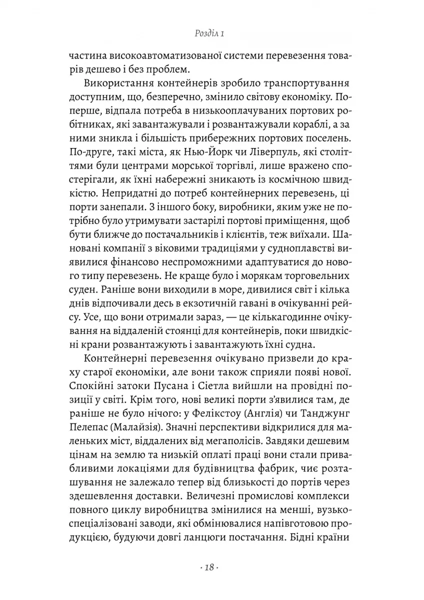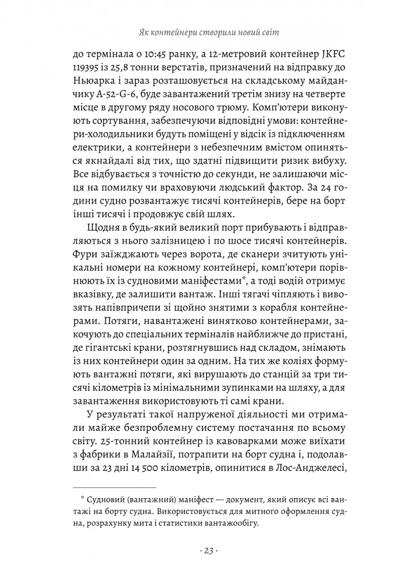 Книжка Марка Левінсона «Як морський контейнер зробив світ меншим, а світову економіку більшою» розповідає про одну з найважливіших інновацій XX століття — транспортний контейнер, який змінив спосіб, яким товари пересуваються світом. Простий металевий ящик, запропонований перевізником Малкомом Макліном, революціонізував морські перевезення, зробивши їх швидшими, дешевшими та ефективнішими.