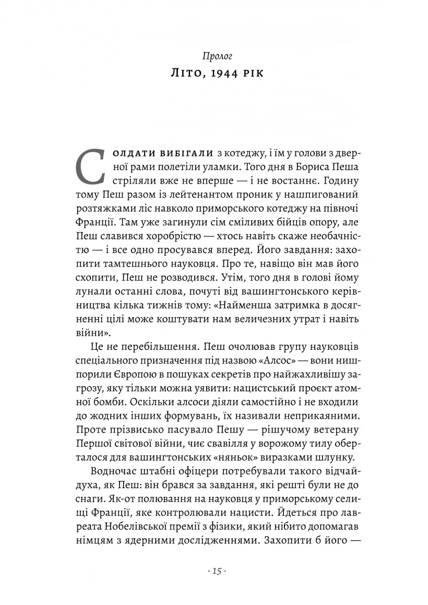 Група «Алсос», що складалася з учених, солдатів і шпигунів, боролася з «Урановим клубом» нацистської Німеччини, використовуючи всі можливі засоби: шпигунство, саботаж, а в окремих випадках навіть вбивства. Ця книга — це розповідь про їхню відважну боротьбу за збереження світу від ядерної катастрофи.