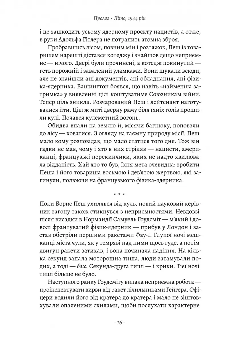 Книга Сема Кіна розповідає про одну з найважливіших і найнебезпечніших операцій Другої світової війни. Це захоплива історія про групу науковців і шпигунів, які вирішили зупинити нацистську Німеччину на шляху до створення ядерної зброї. У той час, як у світі активно працювали над створенням атомної бомби в рамках Мангеттенського проєкту, союзники зіткнулися з жахливою загрозою — Гітлер і його команда науковців випереджали їх у дослідженнях.