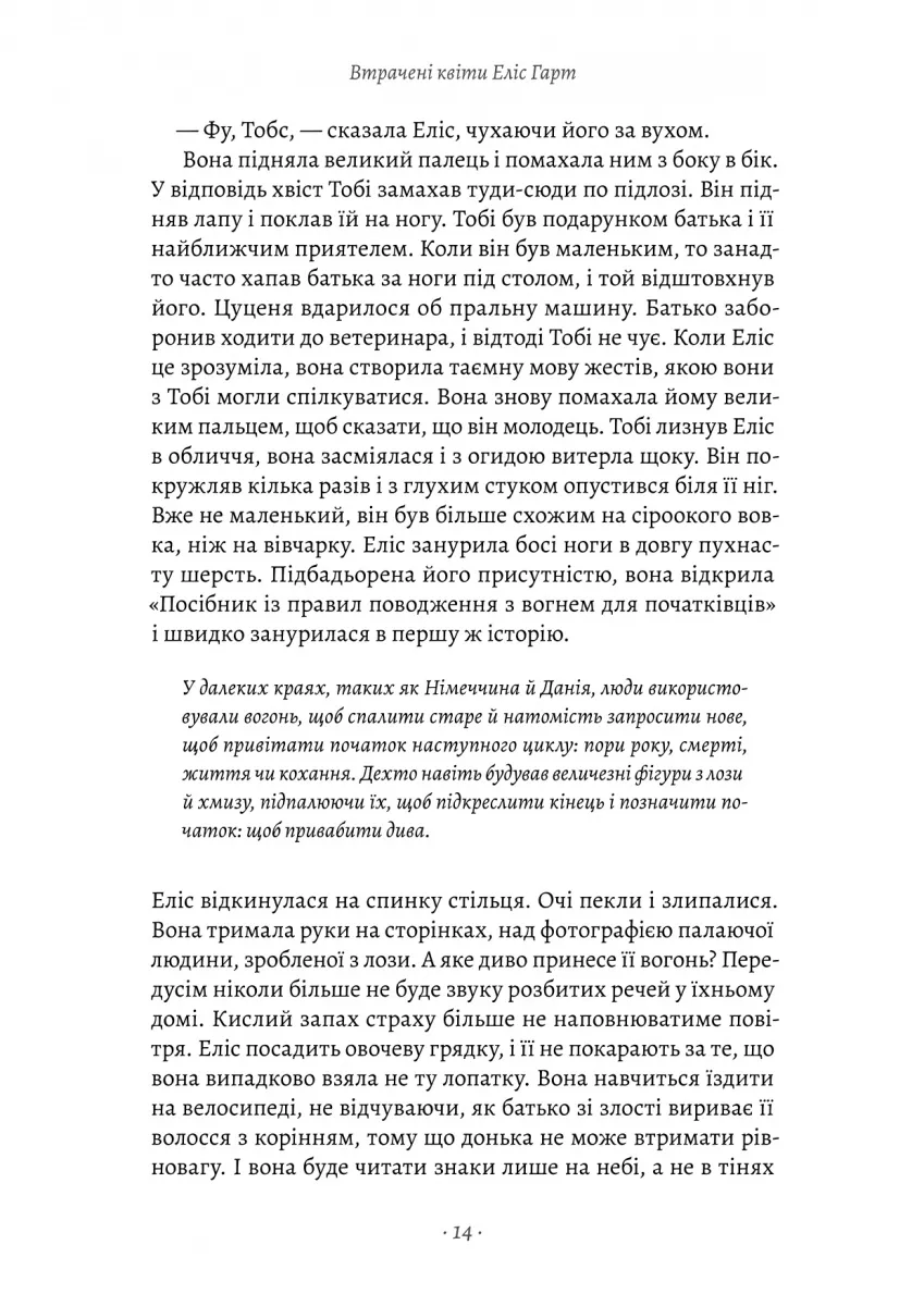 На узбережжі Австралії, за багато-багато миль від найближчого міста, у будинку, наповненому любов’ю матері Аґнес і жорстокістю батька, живе дев'ятирічна Еліс Гарт. Мамин прекрасний сад — це єдине місце, де вона може не боятися, ховаючись від раптових спалахів гніву. Аж доки вогонь, що несе за собою неминучу трагедію і загибель, не змушує Еліс покинути все, чого вона так боялась і водночас так сильно любила.