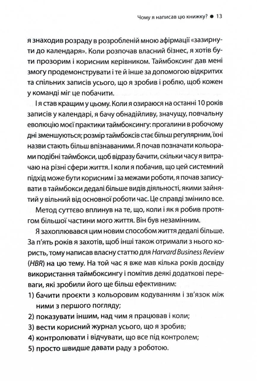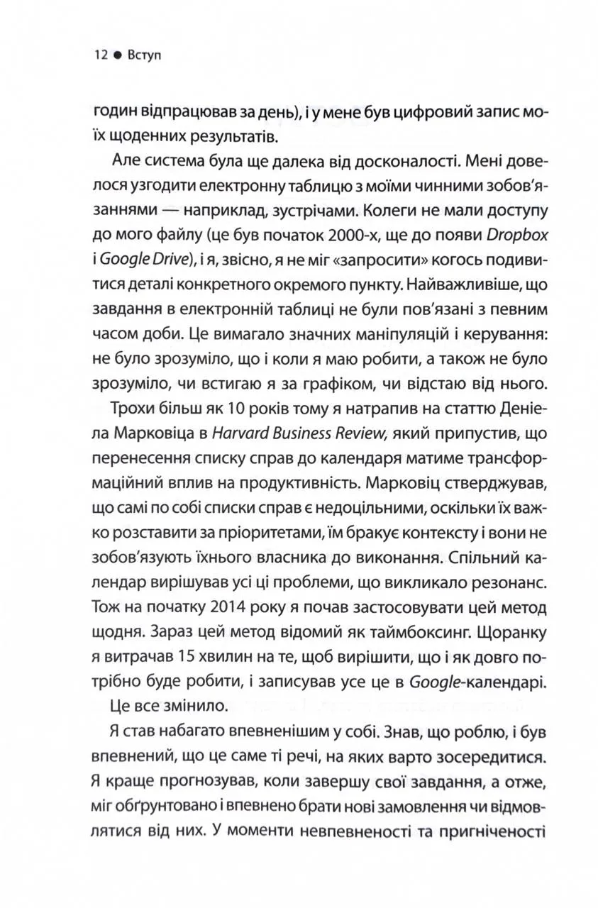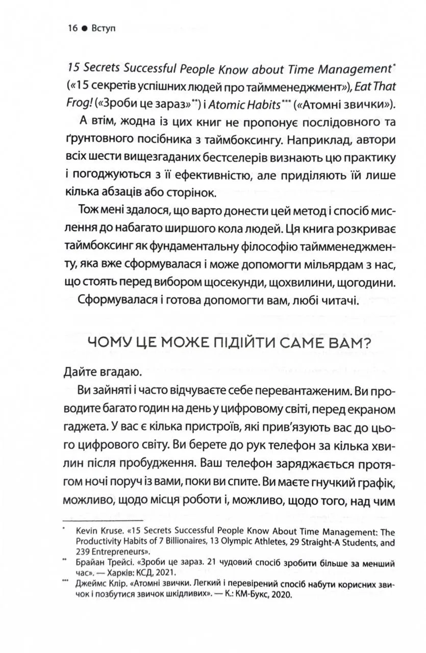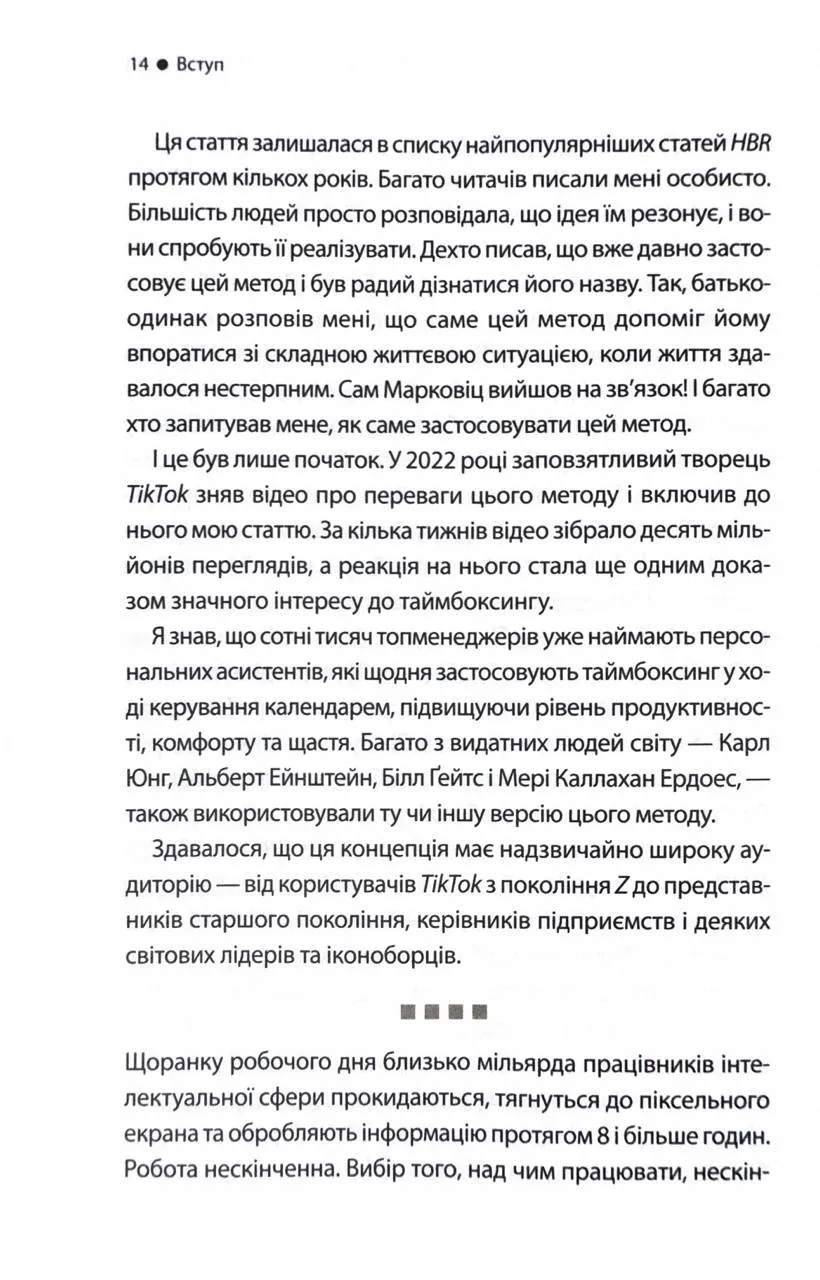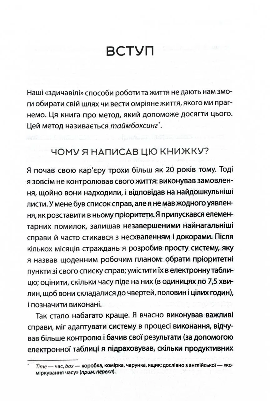 Ви коли-небудь відчували, що, попри всі зусилля, ваша продуктивність недостатня? Таймбоксинг — це метод, який допоможе усвідомити, як обирати найважливіші завдання, коли їх виконувати і як досягти максимального успіху в реалізації задуманого. Безліч видатних особистостей, від Карла Юнга й Альберта Ейнштейна до Білла Гейтса і Стіва Джобса, використовували різні форми таймбоксингу для досягнення успіху.