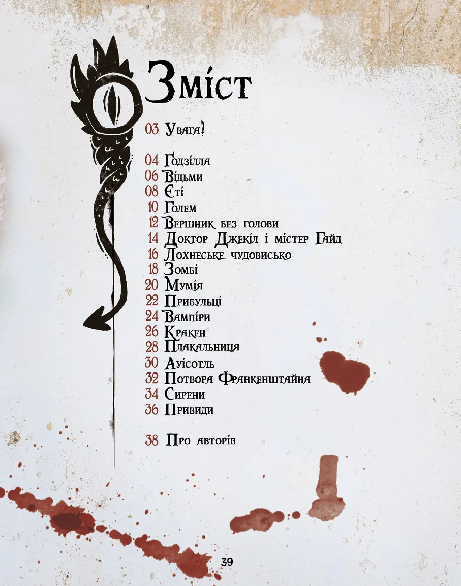 Ця книга зібрала привидів, вампірів, сирен та інших дивних створінь, які водночас страшать і викликають посмішку. Сповнена цікавих фактів і неочікуваних поглядів, енциклопедія дозволить вам побачити легендарних монстрів з нового боку, змушуючи дивуватися і навіть посміхатися. Готуйтеся до захопливої подорожі, яка пробудить вашу уяву та збагатить новими знаннями!