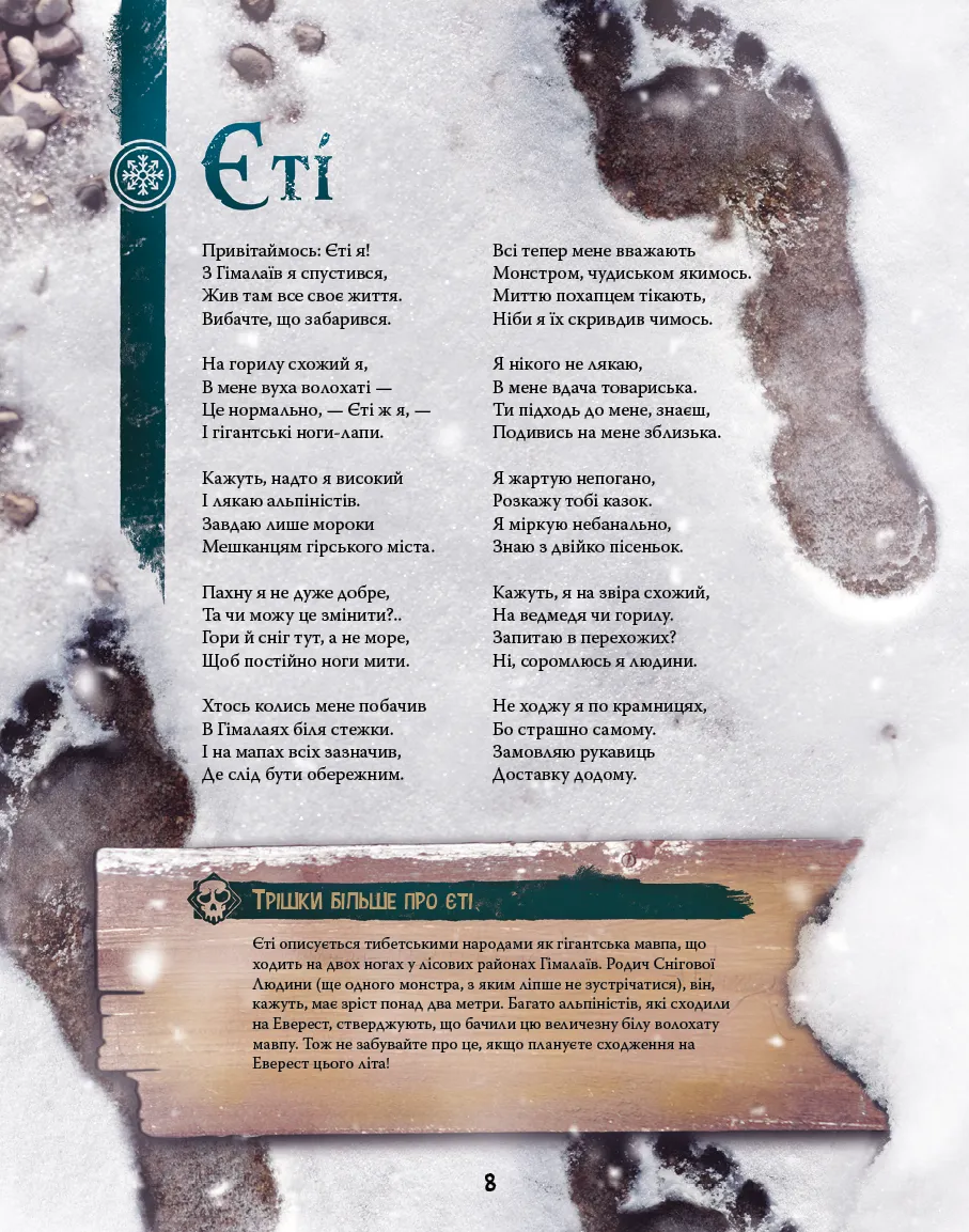 Чи готові ви відкрити завісу таємниць, які приховують загадкові створіння з легенд і переказів? У цій дивовижній енциклопедії перед вами оживуть істоти, що століттями зачаровували й лякали людей: від могутньої Ґодзілли, з її нищівною силою, до таємничого Єті, що постійно вислизає з-під уваги дослідників. Ви дізнаєтеся, що насправді приховує Лохнеське чудовисько, та чи справді Франкенштайн мріє про щось, крім жаху.