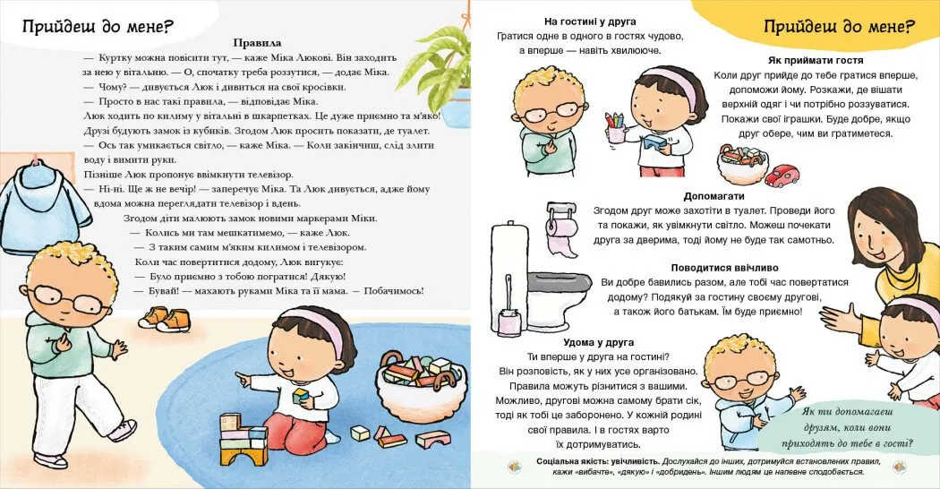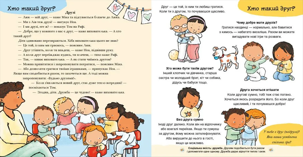 Ця чудова книжка стане першою путівником малюка у світі дружби! Вона пояснює, що таке справжня дружба, як заводити друзів і як підтримувати теплі стосунки. Дитина дізнається, як запрошувати друзів у гості, справлятися зі сварками та миритися. Кожна мініісторія розвиває одну з важливих соціальних якостей: любов, емпатію, повагу чи впевненість. Практичні поради допоможуть дитині орієнтуватися в різних ситуаціях, пов'язаних із дружбою. Ця книжка стане ідеальним вибором для розвитку у малюка соціальних навичок, необхідних для створення і підтримання дружніх стосунків.