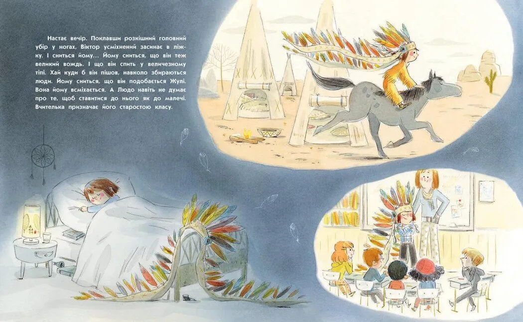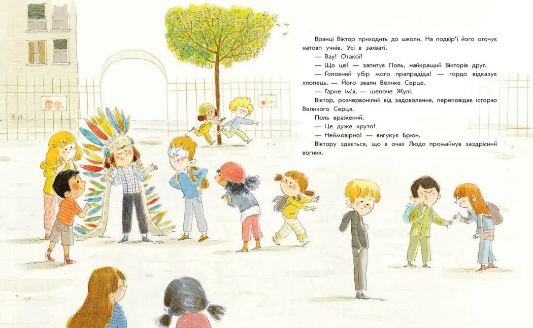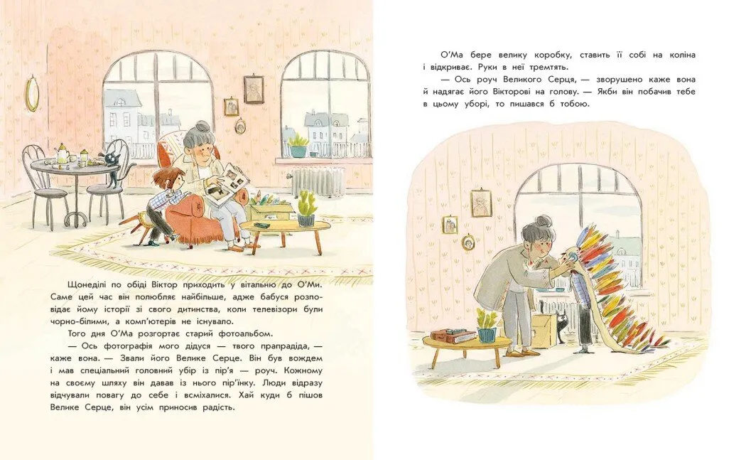 Софі де Мюлленгайм, відома авторка з Європи, більше 20 років пише захопливі й повчальні історії для дітей. У цій книзі вона розповідає про Віктора, хлопчика, який мріє про дружбу і хоче, щоб його любили. Бачачи його сум, бабуся О’Ма ділиться з ним особливим секретом. Вона дарує Вікторові головний убір індіанського вождя, що колись мав велике серце і дарував людям радість. Через цю символічну річ Віктор відкриває для себе силу щедрості та дізнається, що щасливим можна бути, коли даруєш іншим, адже це приносить теплоту і наповнює душу.