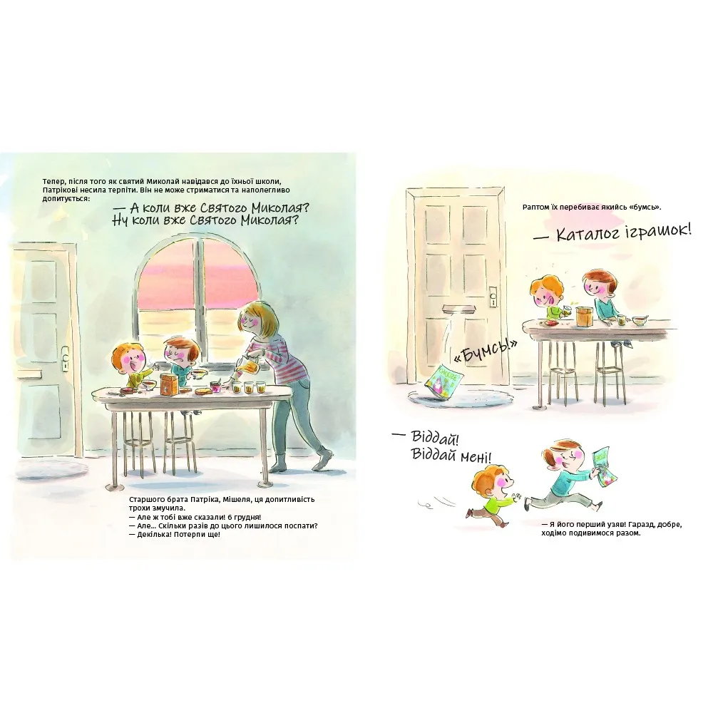 Ця ілюстрована книжка для дітей переносить читачів у чарівний світ очікування Дня Святого Миколая. Головний герой, маленький хлопчик, із трепетом рахує дні до свята, запитуючи у дорослих, коли настане цей особливий день. Разом із ним діти знайомляться з традиціями, що супроводжують це свято, — приготуванням чобітків, куди Святий Миколай кладе подарунки, і теплим сімейним очікуванням дива.