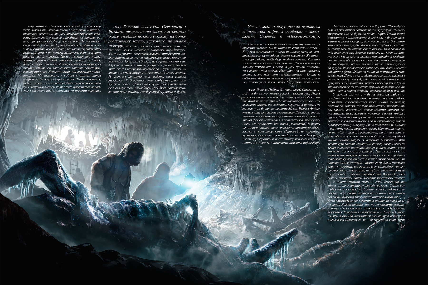 Спочатку все виглядало як науковий тріумф: біолог експедиції, професор Лейк, знайшов скам’янілості невідомих істот. Але після бурі зникли всі зв’язки з його групою. Підозрюючи найгірше, Даєр вирушив на пошуки... і виявив жахи, які неможливо описати словами.