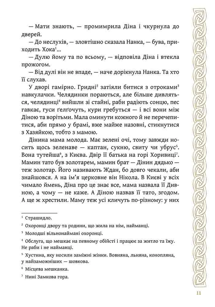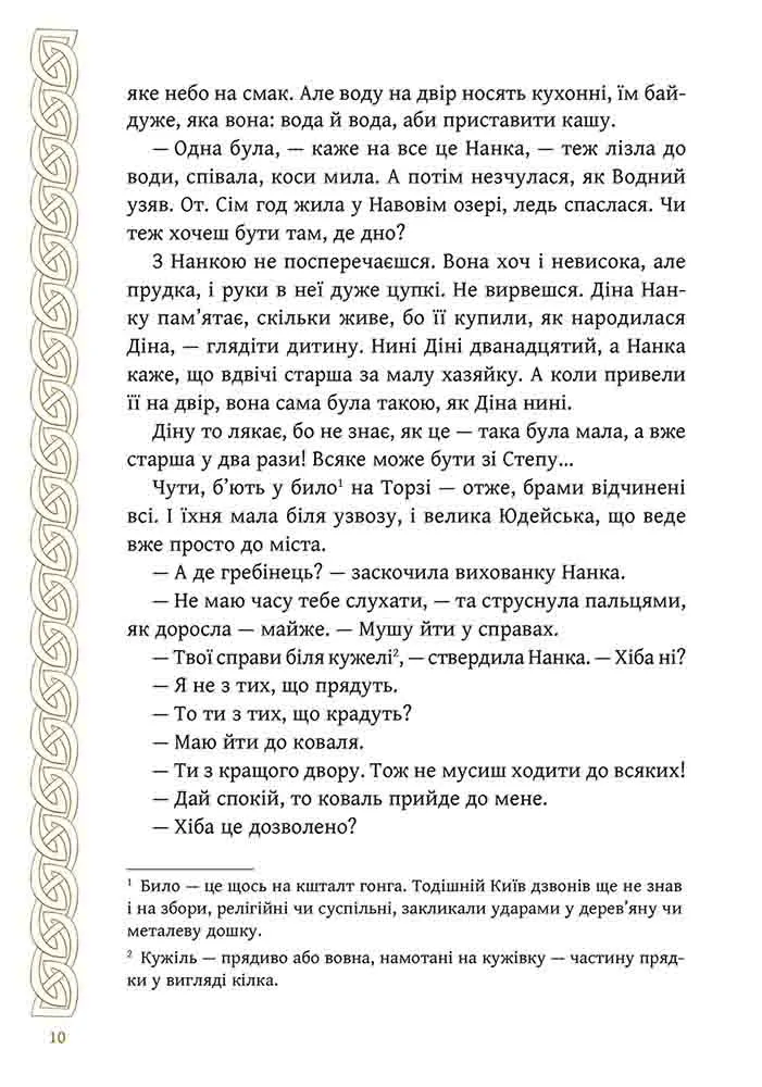 Діна — юна, але мудра не по роках дочка воїна і племінниця ювеліра. Завдяки її спостережливості, сміливості та жаги до істини ми поринемо в атмосферу давнього Києва: блиск княжих палат, ремісницькі майстерні, небезпечні вулиці й приховані інтриги.