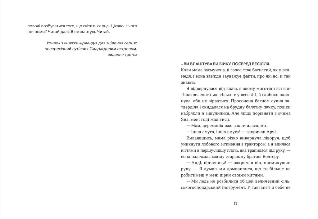 Адді, тримаючи в руках путівник «Ірландія для зцілення серця», намагається знайти відповіді на свої внутрішні питання, подолати зраду, зміцнити зв’язок із братом і знайти гармонію в собі. Ця книжка — тепла й зворушлива історія, яка надихає не боятися змін і завжди рухатися вперед.