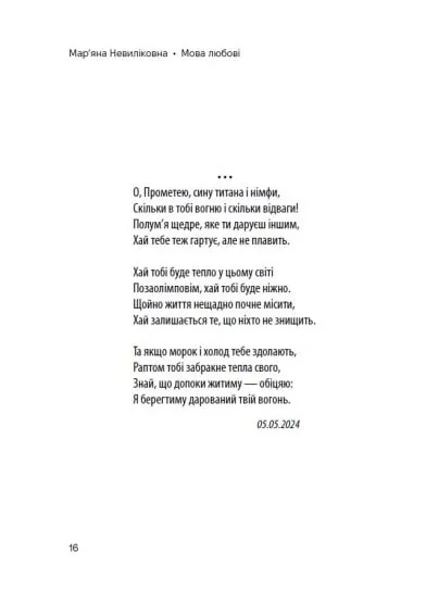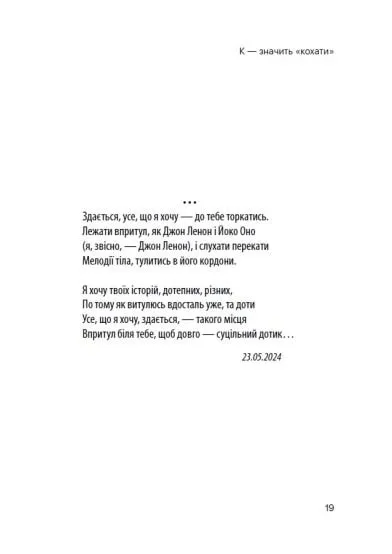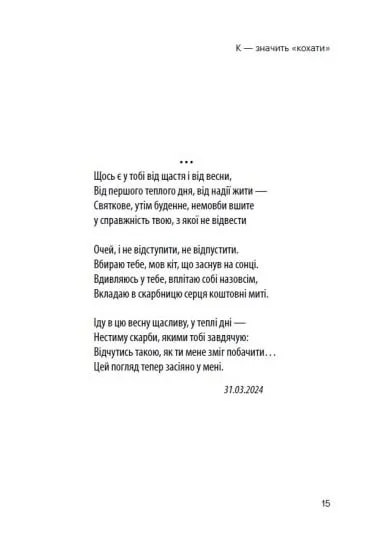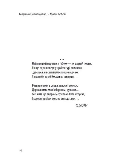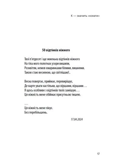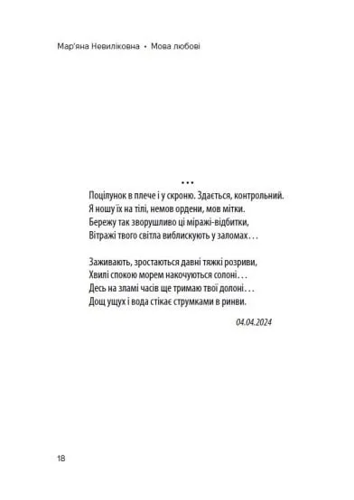 Вірші не тільки відображають особисті переживання, але й дають глибокий погляд на універсальні теми, що хвилюють кожного з нас: від пошуків кохання та ідентичності до роздумів про межі існування, війну та взаємодію з тілесністю й тілом. Творчість авторки — це своєрідний щоденник, який переповідає її шлях через важкі, але важливі періоди життя.