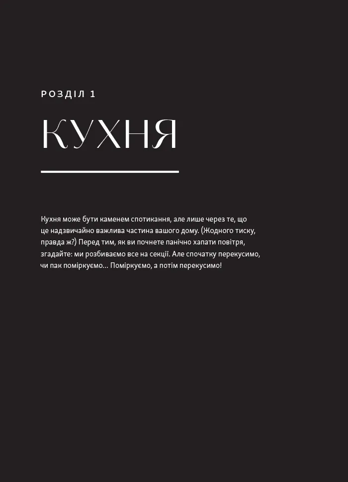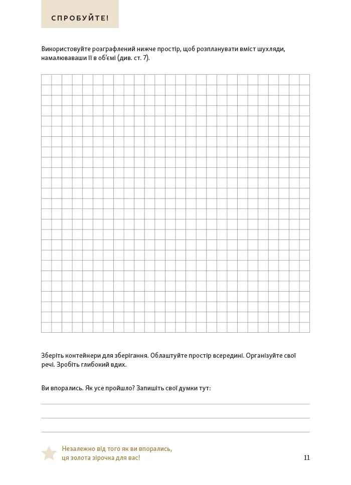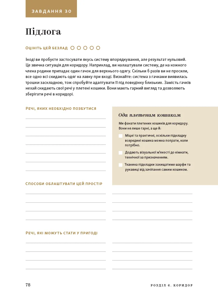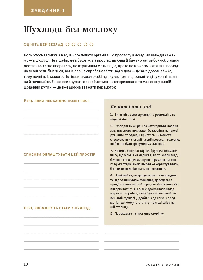 Книга створена, щоб допомогти вам навести порядок у домі, слідуючи власному темпу. Ви можете вирішувати по одному завданню щотижня або організувати весь дім за кілька місяців. Завдання охоплюють різноманітні аспекти — від очищення шухляд від непотребу до дизайну шаф і сортування додатків на телефоні.