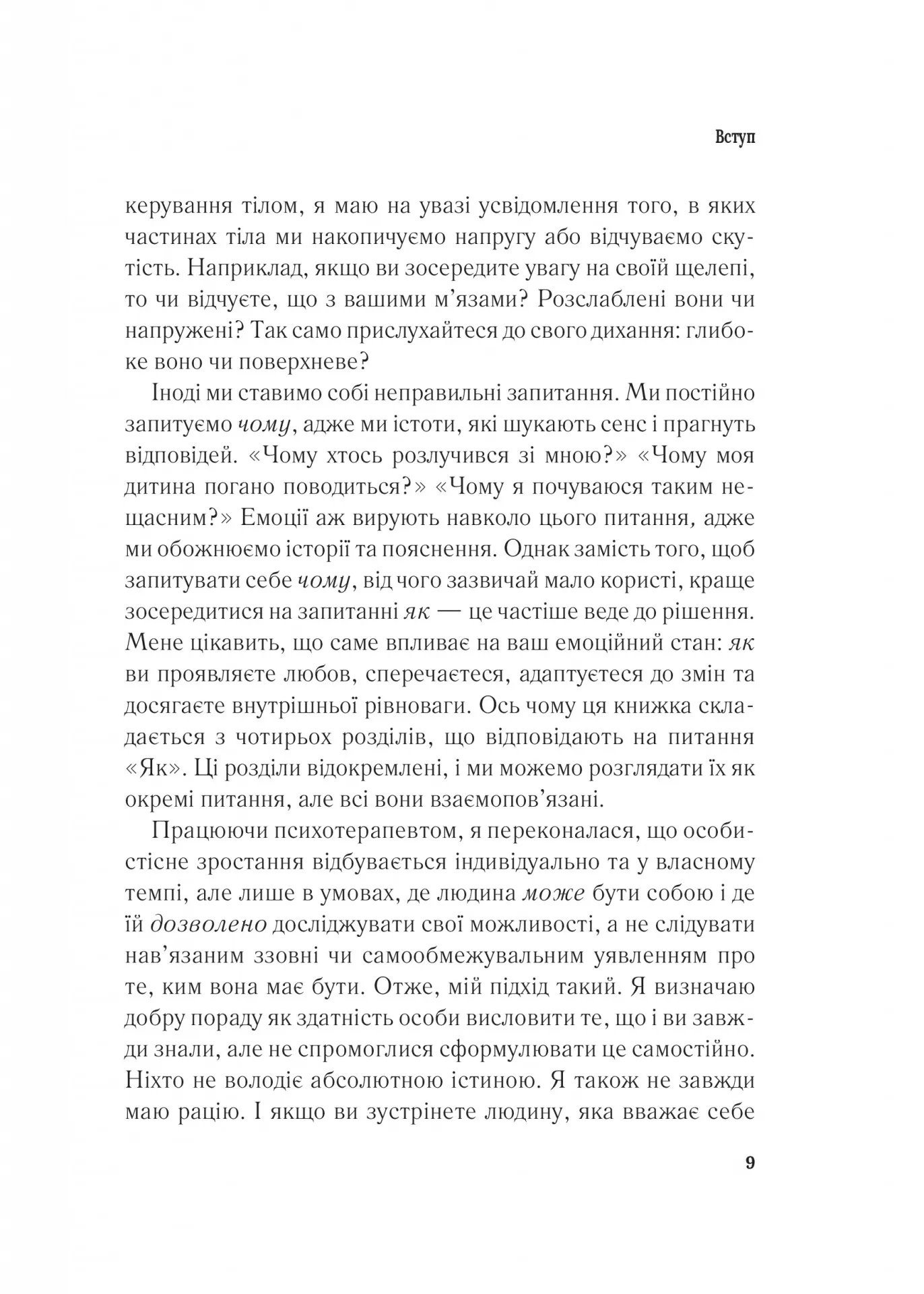 Авторка пропонує дієві стратегії, як налагодити стосунки, зменшити стрес, подолати тривогу та навчитися спілкуватися без конфліктів. Від питань про типи прив’язаності до прийняття себе та свого тіла, від емоційних втрат до кризи середнього віку — ця книга стане справжнім путівником до щасливого життя.