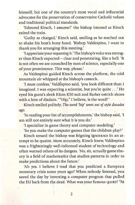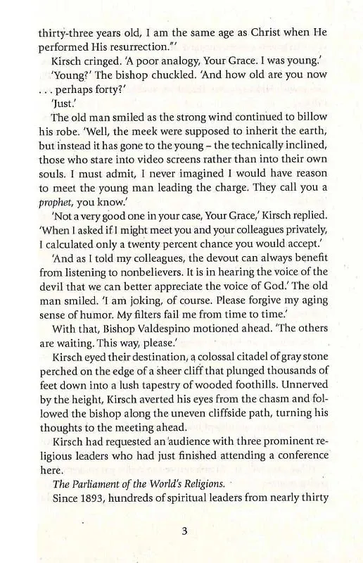 Але ретельно спланований вечір обертається хаосом, коли все несподівано виходить з-під контролю. Виникає реальна загроза, що безцінне відкриття Кірша буде втрачено. Опинившись у смертельній небезпеці, Ленгдон змушений тікати з Більбао разом із директоркою музею Амброю Відаль. Удвох вони вирушають до Барселони в небезпечну подорож, щоб знайти загадковий пароль, який розкриє таємницю Кірша.
