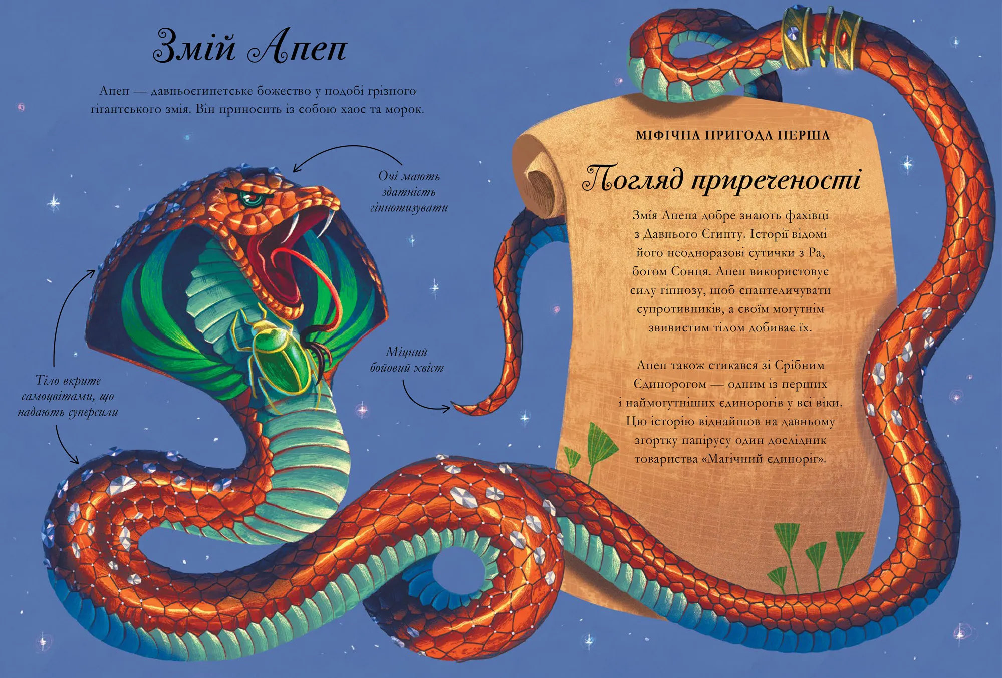 Товариство «Магічний єдиноріг», яке захищає та оберігає магічних єдинорогів підготувало ще одне ілюстроване видання для юних читачів.Тут аж вісім історій про пригоди улюблених магічних створінь, які зачарують кожного достоту. У них розповідається про перегони єдинорогів з Піщаним драконом у пустелі, про пошуки Крилатого лева в магічному лабіринті, як відгадати загадки Кам’яного троля. Тут є розповіді про драконів, феніксів, які повстали з попелу, містичних кракенів, які ховаються на дні моря, про чортів, духів і перевертнів у лісах. Читач дізнається про вісім чаклунських сімей єдинорогів та вісім міфічних істот, з якими їм доведеться мати справу та про суперсили, якими всі вони володіють. В кінці книжки можна навіть визначити, з якою з цих істот ви споріднені.