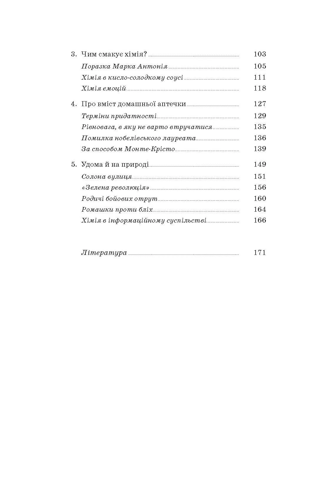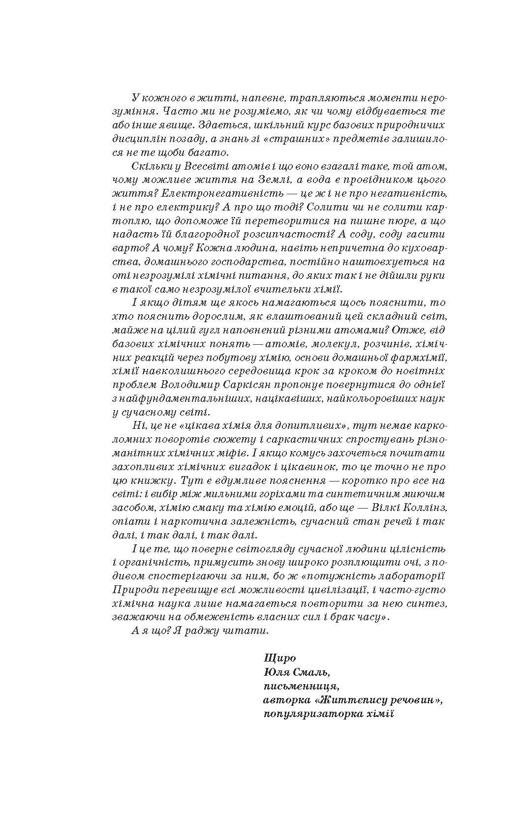 У своїй книзі хімік-токсиколог Володимир Саркісян відкриває завісу над цими таємницями. Він доступно пояснює, як працює хімія у нашому житті: від приготування їжі до прання, від боротьби з ожеледицею до вибору ліків. Тут ви знайдете не лише формули, але й практичні поради: коли краще солити картоплю, чому гомеопатія не може отруїти чи вилікувати, як діють пестициди, шампунь і навіть марихуана.