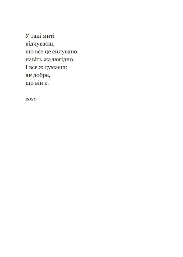 Вірші, написані у цей складний час, сповнені гіркоти. Вони розмірковують про відносність цінностей, які здавалися абсолютними, про обмеженість емпатії та солідарності, про розчарування і невимовний біль. Ця збірка про період, коли «усі поняття і явища світу вміщуються у кілька слів».