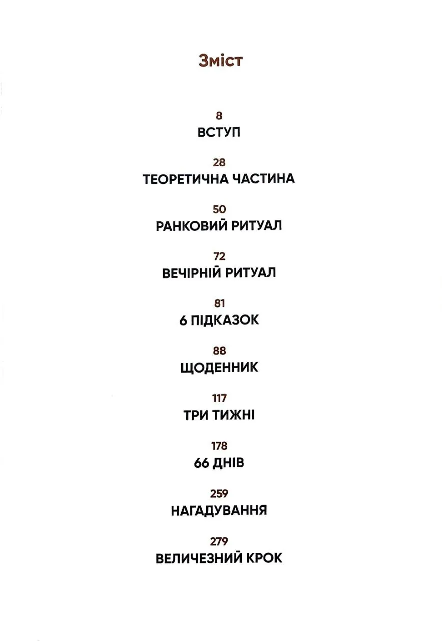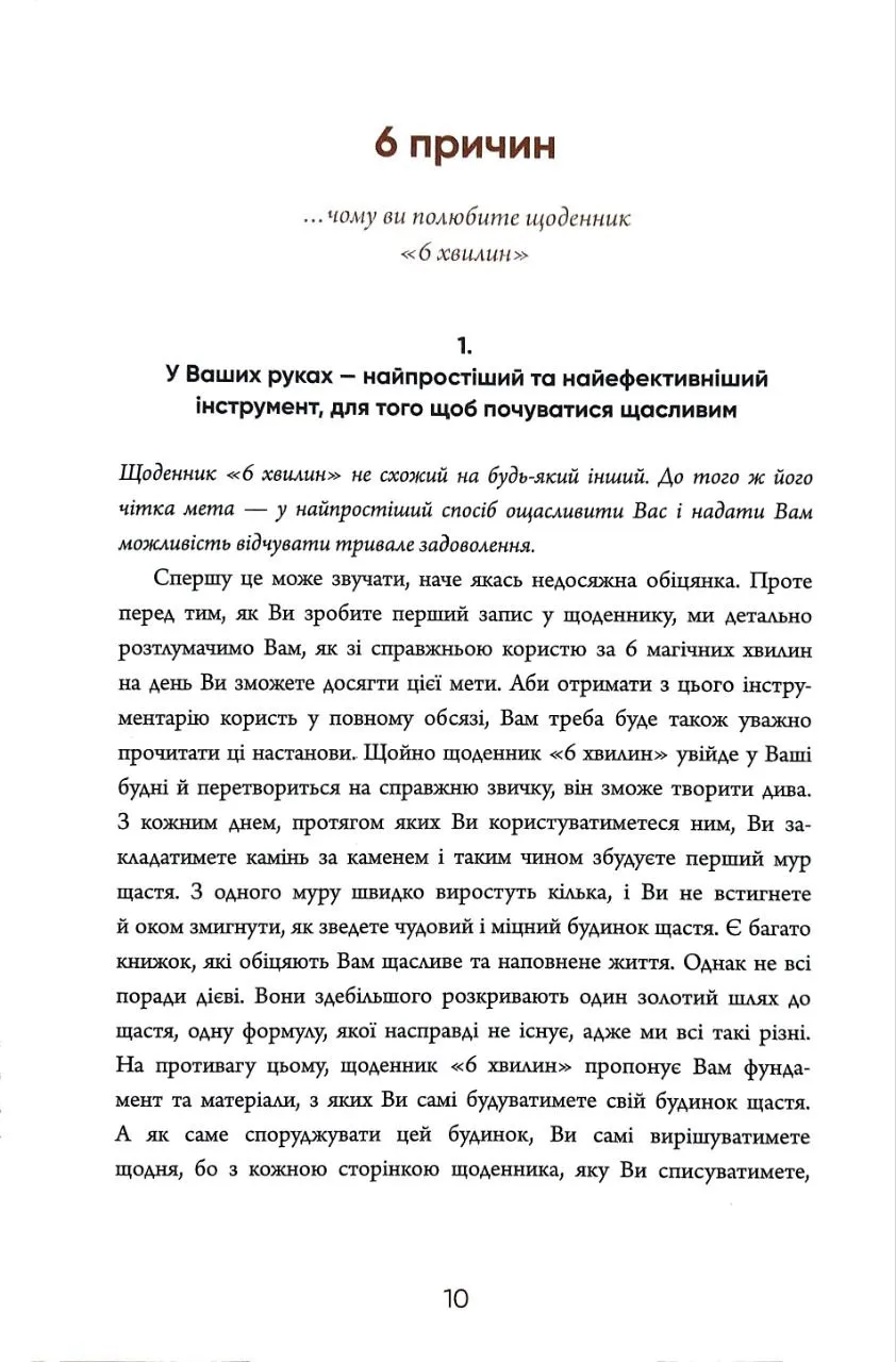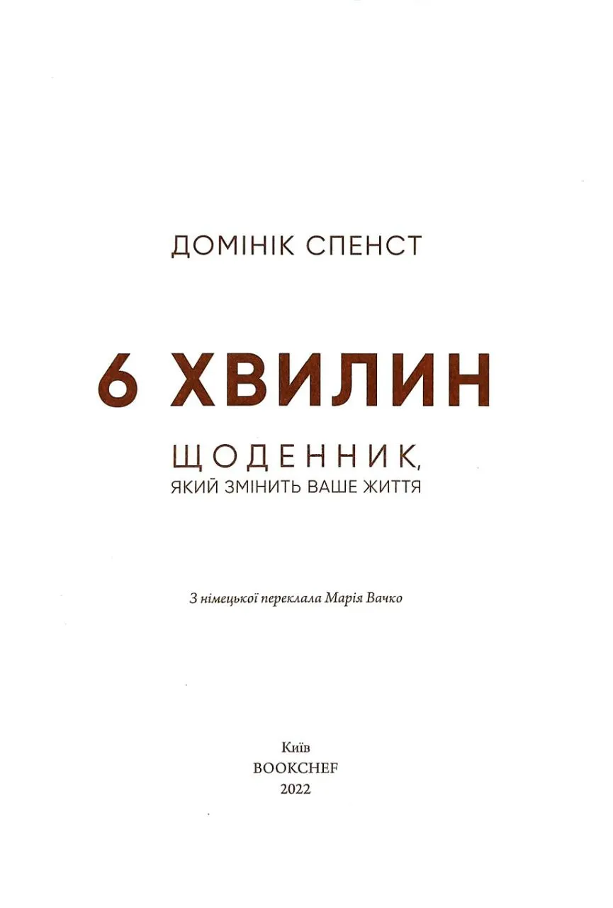 Кожен із нас хоче стати щасливим, упевненим у собі й успішним. Ми читаємо розумні книги з порадами, як цього досягти. Щороку / щомісяця / щопонеділка починаємо докладати певних зусиль, прямуючи до поставленої мети. Однак постійно щось іде не так, і ми опускаємо руки, бо у нас немає часу / сил / змоги впроваджувати такі необхідні зміни у своє життя. Усе це врахував німецький економіст Домінік Спенст. Він створив унікальний щоденник «6 хвилин», який допоможе вам не відкладати зміни на потім. Витрачаючи лише 3 хвилини вранці й 3 хвилини увечері, ви зможете сформувати корисні звички, які допоможуть зробити ваше життя більш усвідомленим, гармонійним і щасливим. Перевірені на практиці методи не дозволять вам припинити роботу над собою, а відтак ви зможете завершити розпочату трансформацію.