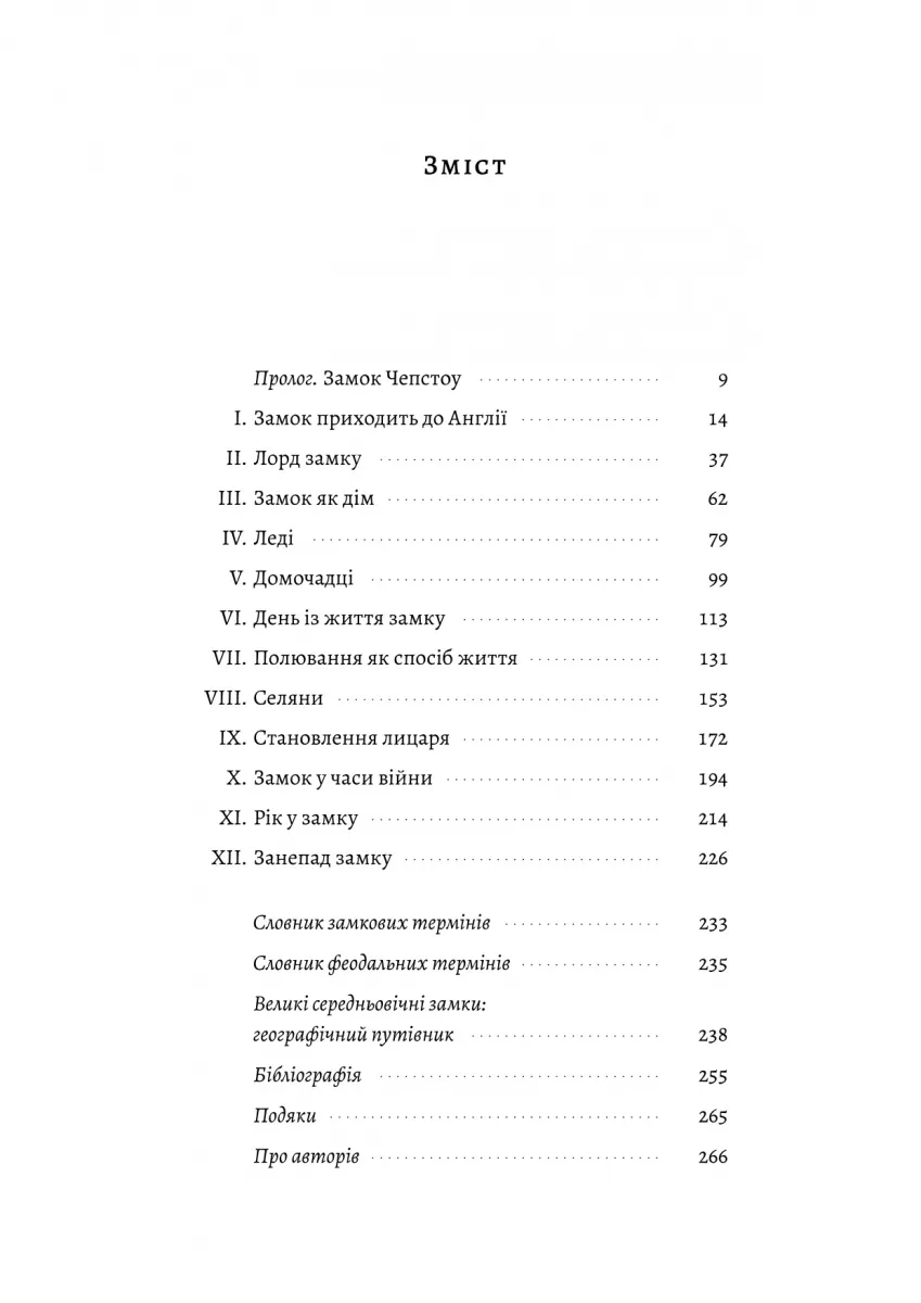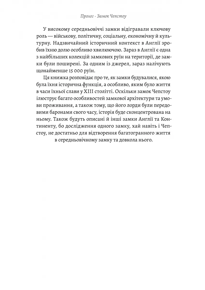 Ця книга розкриває всі аспекти життя середньовічного замку — від звичаїв, що визначали соціальний порядок, до ролі замку як фортеці, яка захищала від ворогів. Відповіді на питання, як влаштовані були замкові стіни, що їли люди, які вбрання носили лицарі й дам, а також які обряди і ритуали проводилися, стануть незамінним ресурсом для тих, хто цікавиться історією, літературою чи створенням історичних світів.