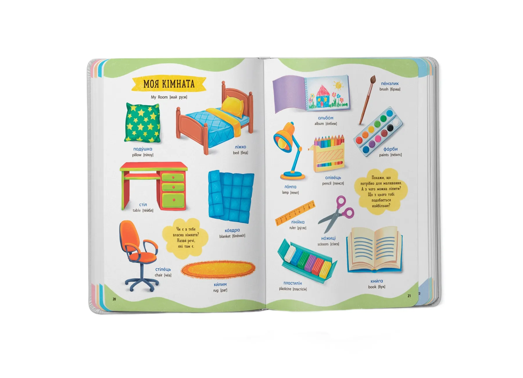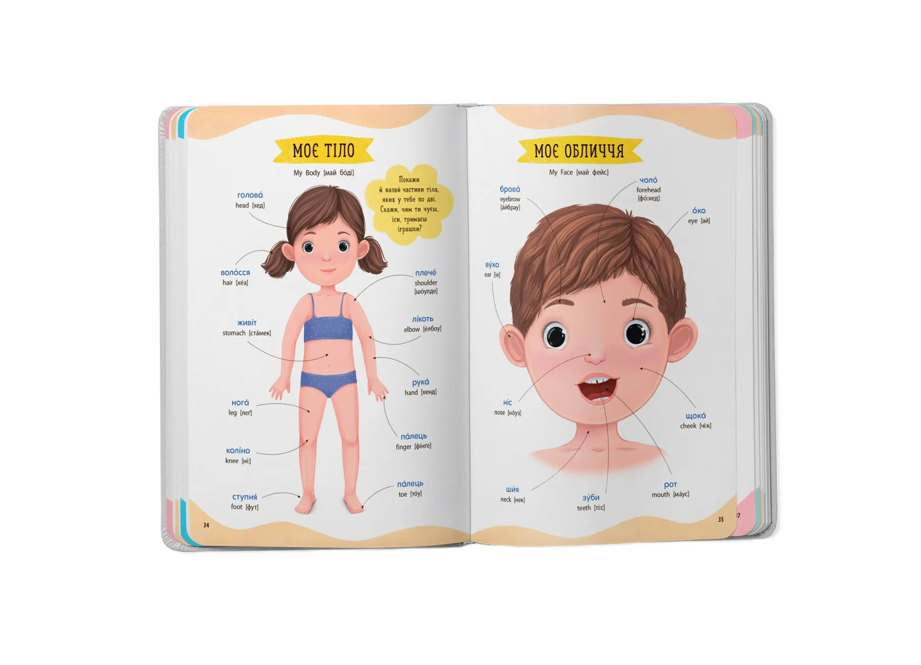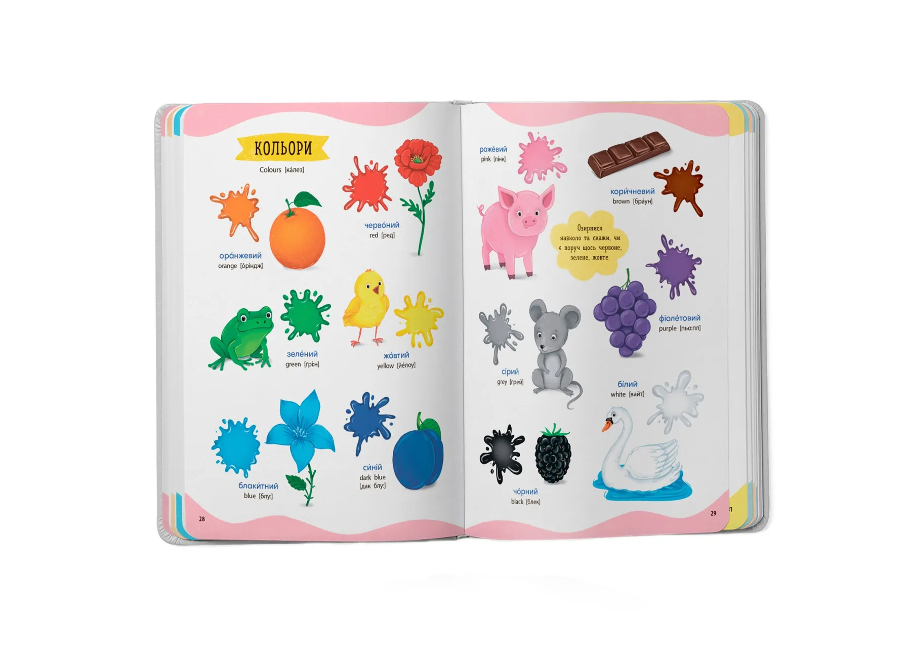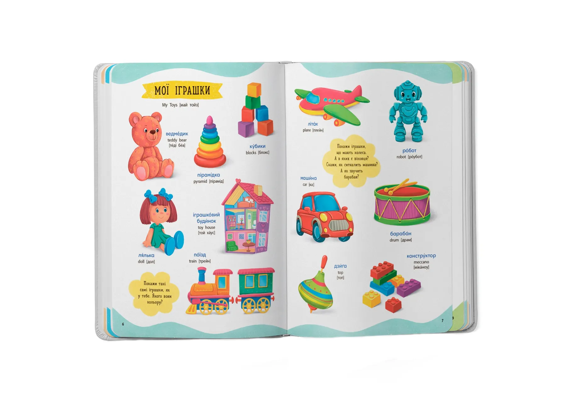 Ця книжка допоможе дитині в ігровій формі дізнатися нові слова, зробити перші кроки у вивченні навколишнього світу, розвинути мовлення та логічне мислення, навчитися чіткій та правильній вимові, розширить словниковий запас. На кожному розвороті малюк розглядатиме великі кольорові малюнки і дізнаватиметься нові слова, відшукуватиме задані предмети, відповідатиме на запитання. Підписи у книжці подано двома мовами, що дозволить прищеплювати знання англійської із самого малечку. Видання призначене для читання батьками дітям віком від півроку.