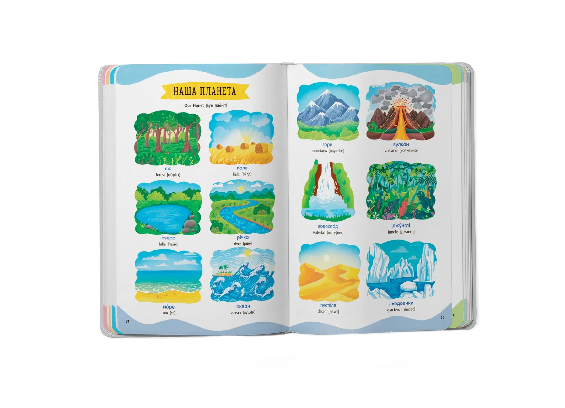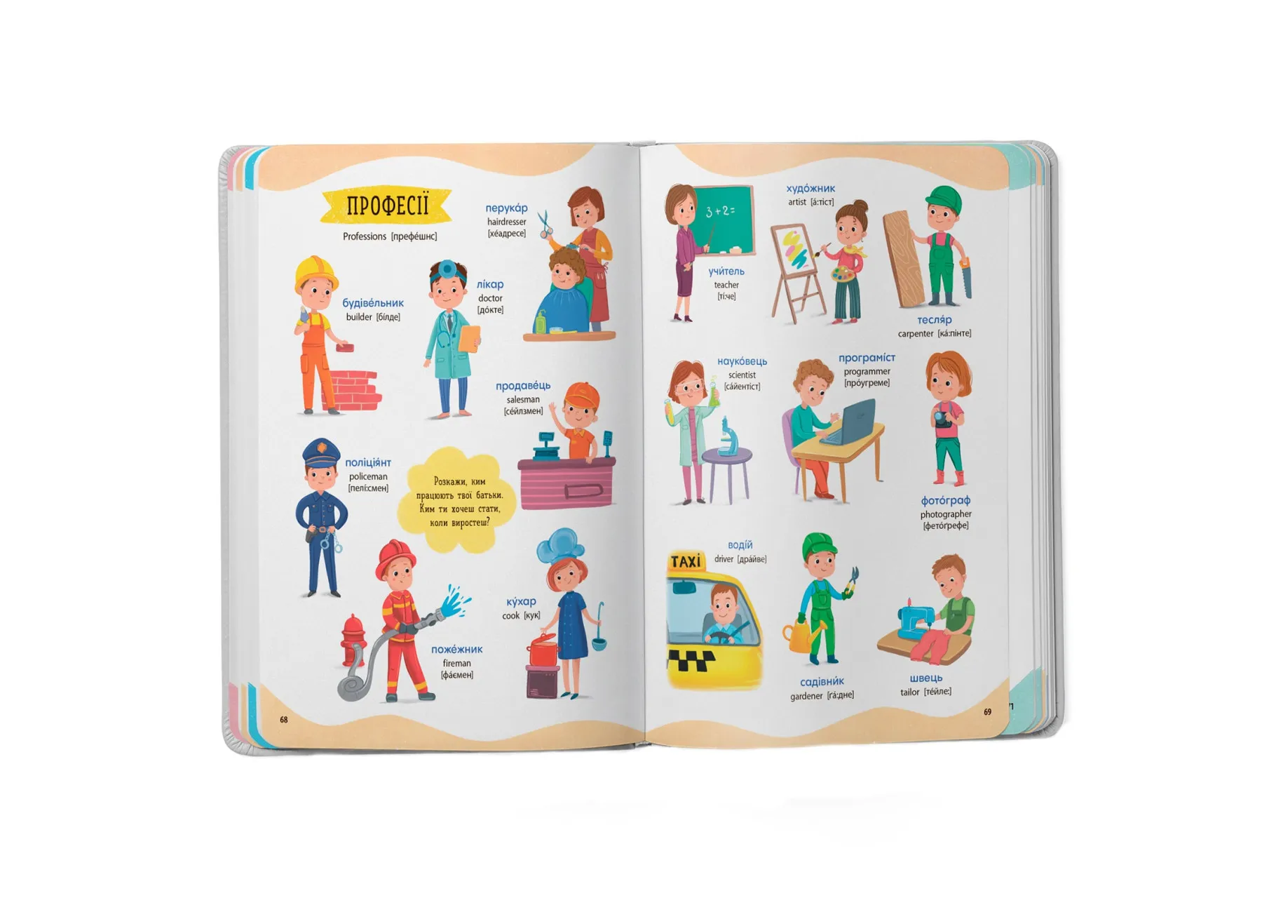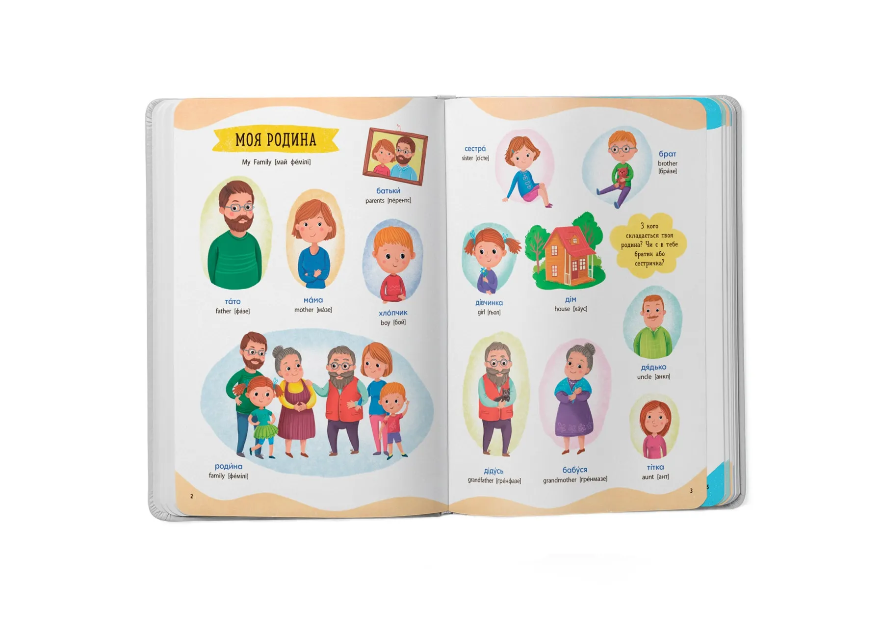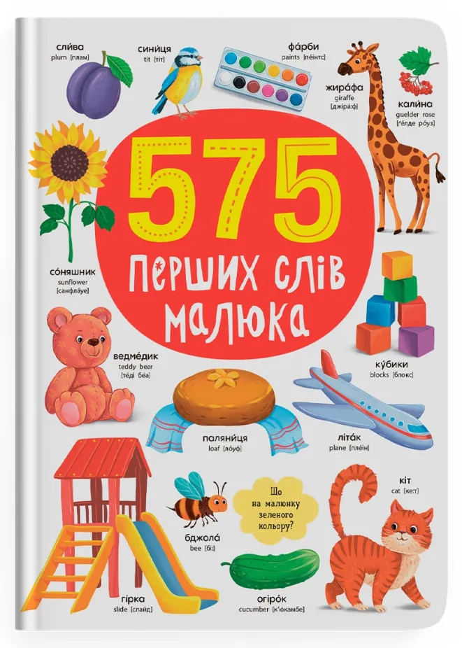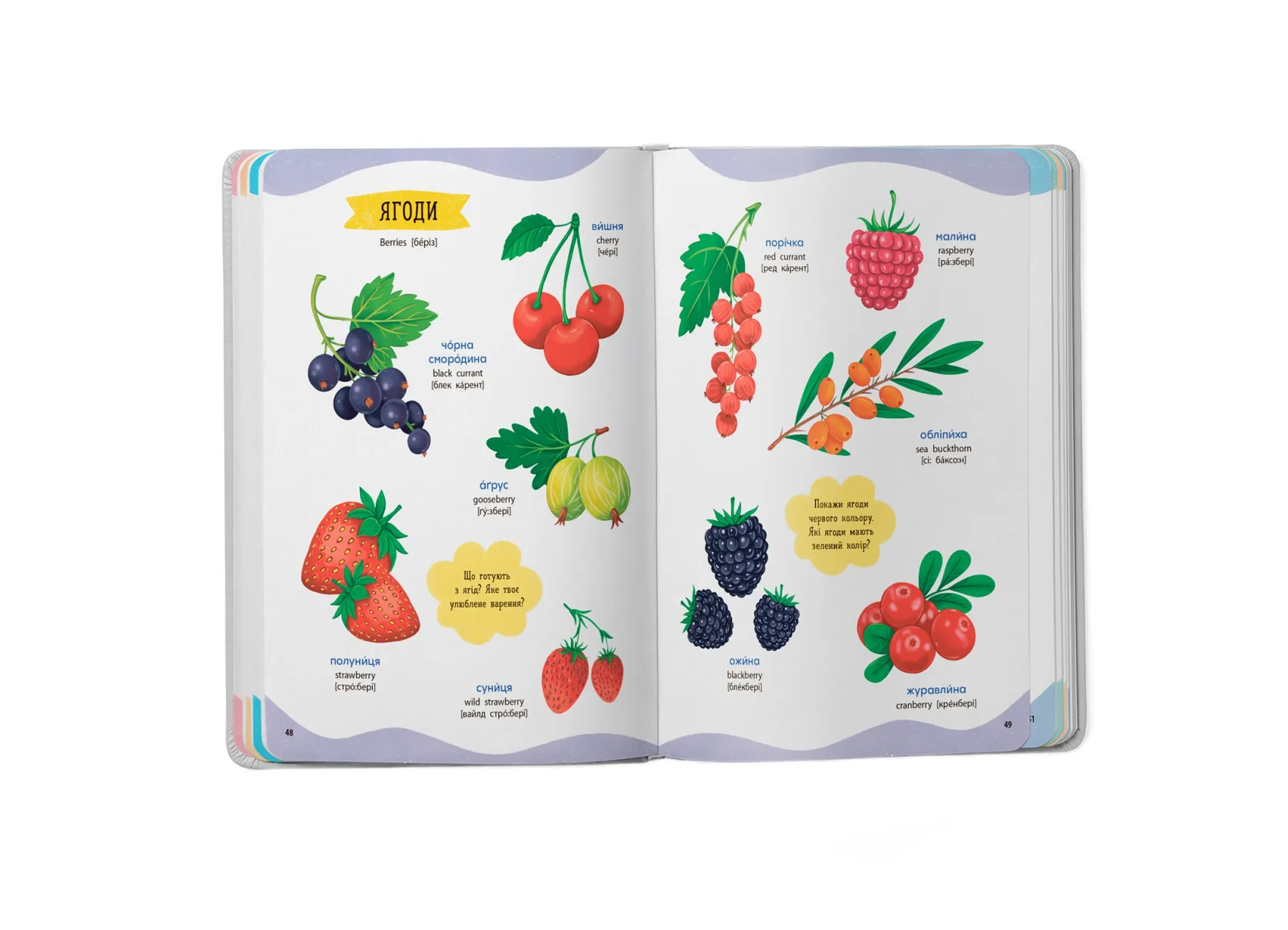Ця книжка допоможе дитині в ігровій формі дізнатися нові слова, зробити перші кроки у вивченні навколишнього світу, розвинути мовлення та логічне мислення, навчитися чіткій та правильній вимові, розширить словниковий запас. На кожному розвороті малюк розглядатиме великі кольорові малюнки і дізнаватиметься нові слова, відшукуватиме задані предмети, відповідатиме на запитання. Підписи у книжці подано двома мовами, що дозволить прищеплювати знання англійської із самого малечку. Видання призначене для читання батьками дітям віком від півроку.