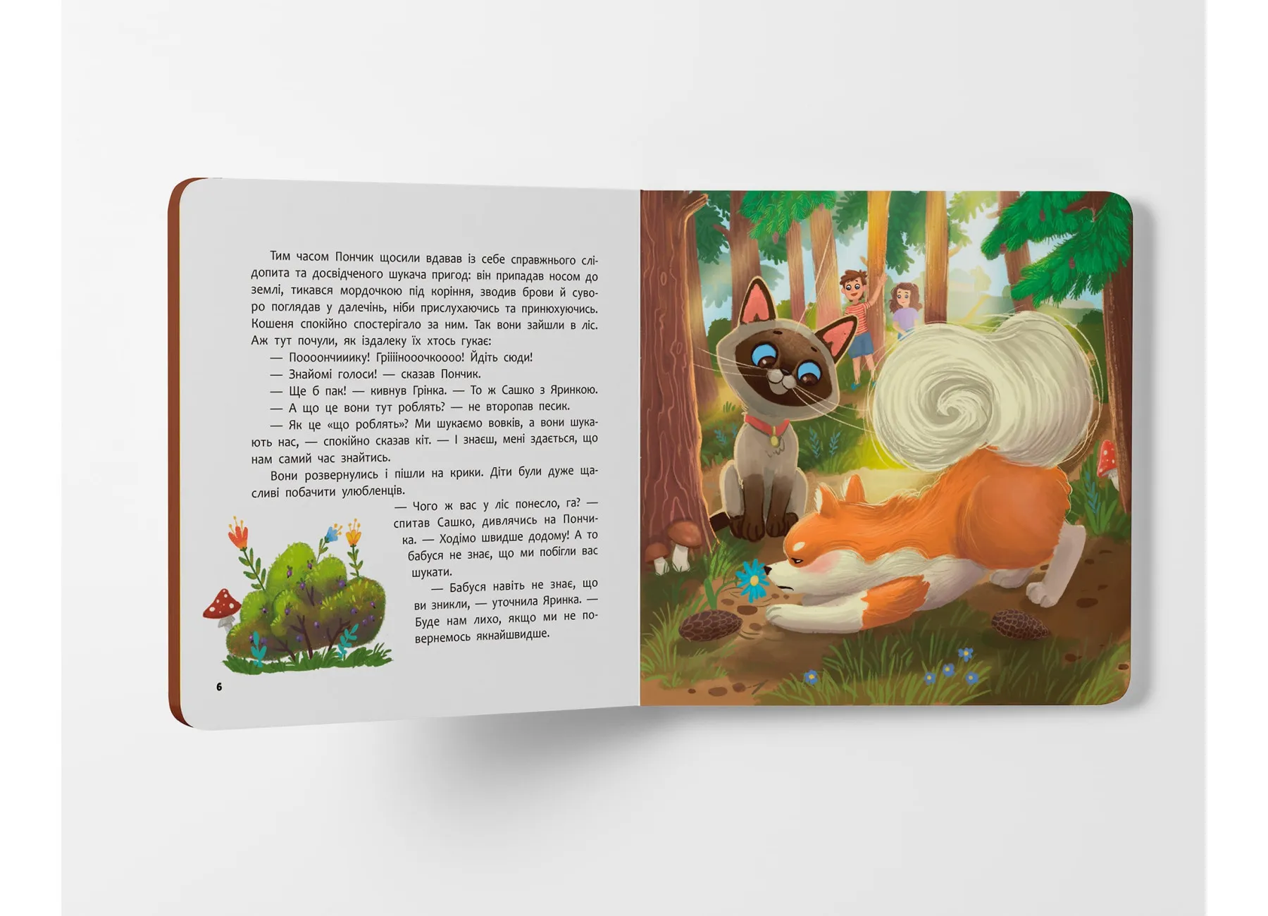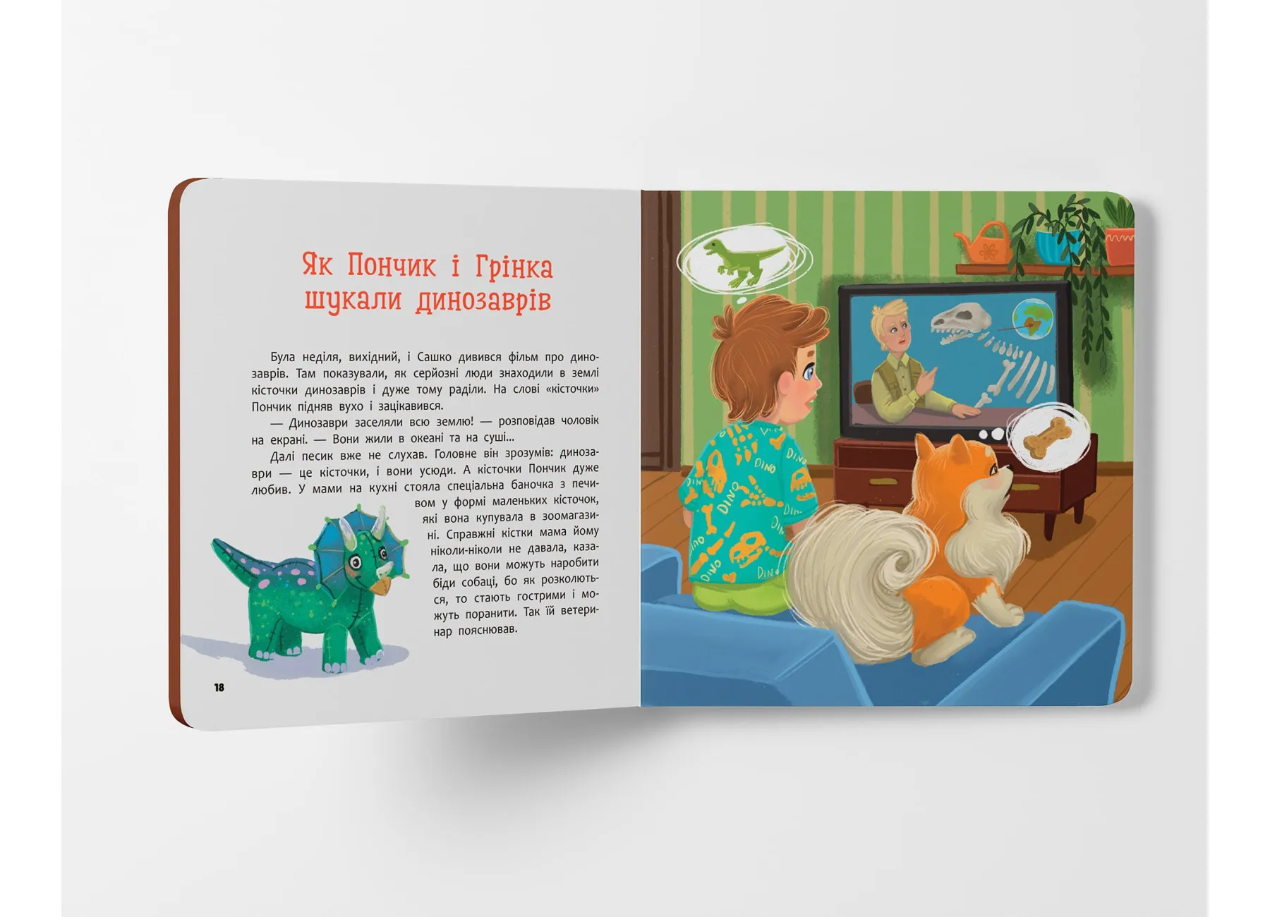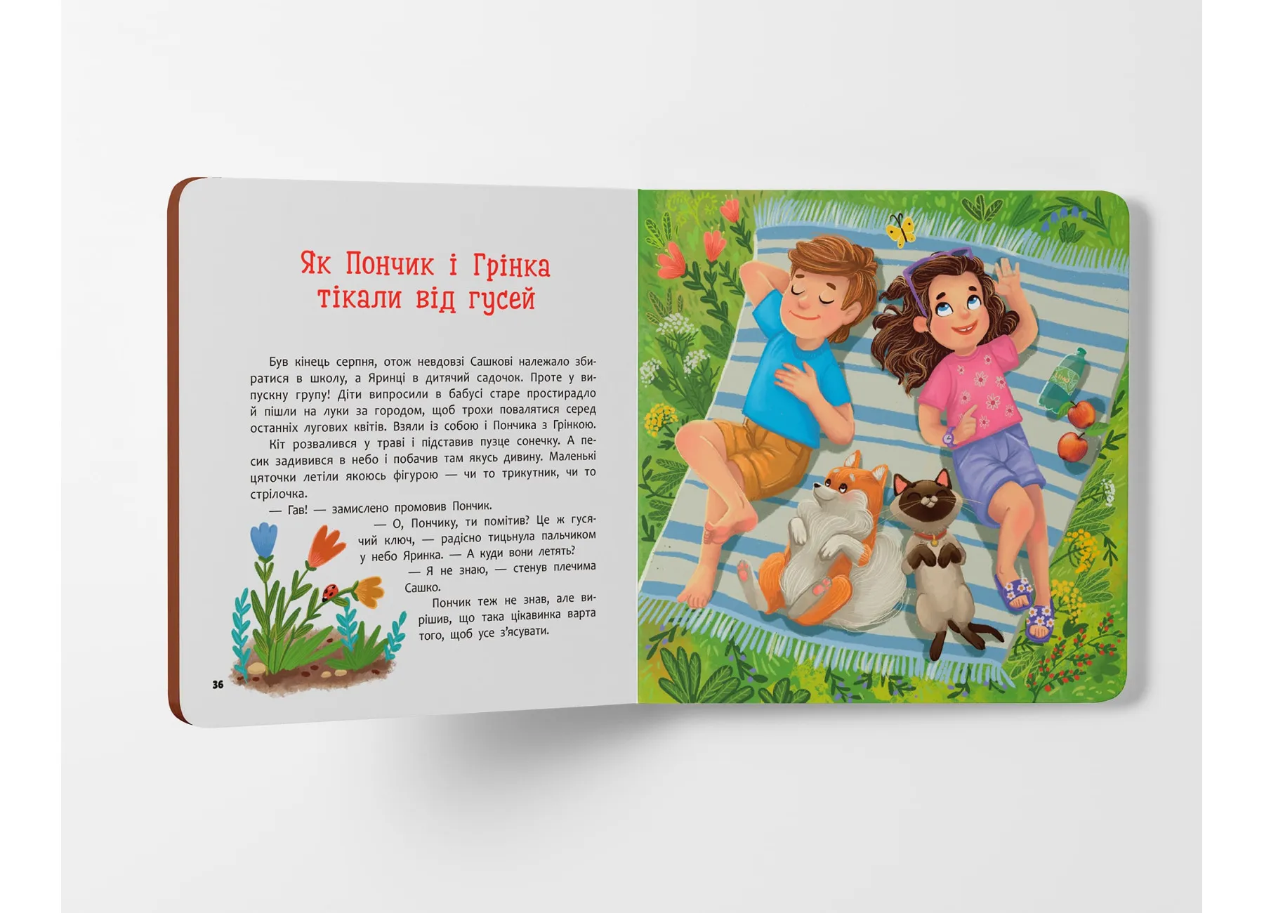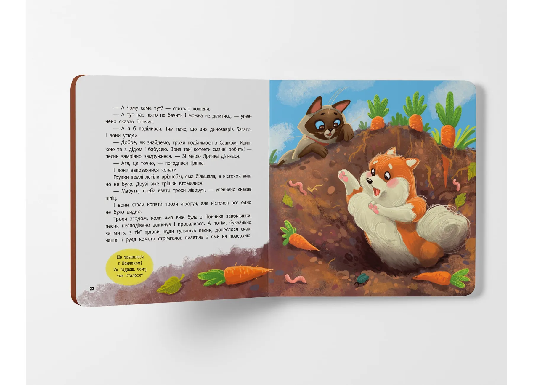 Ця весела та яскраво ілюстрована книжка познайомить маленьких читачів із добродушним песиком Пончиком і його веселим другом — кошеням Грінкою. Разом із цими кумедними героями діти вирушать у захопливі пригоди за місто, щоб дізнатися, чим може обернутися надмірна цікавість, чи справді собаки є родичами вовків і хто має найкращий нюх. Юні читачі з’ясують, чому Пончик вирішив перевтілитися на справжнього кота, як справжні друзі захищають одне одного від насмішок, чи залишилися динозаври у світі й чи може пес стати палеонтологом. А ще дізнаються, які скарби можна знайти в бабусиному городі, чим можна ощасливити когось навіть через роки, що люблять їсти їжаки та чи має гусак зуби.