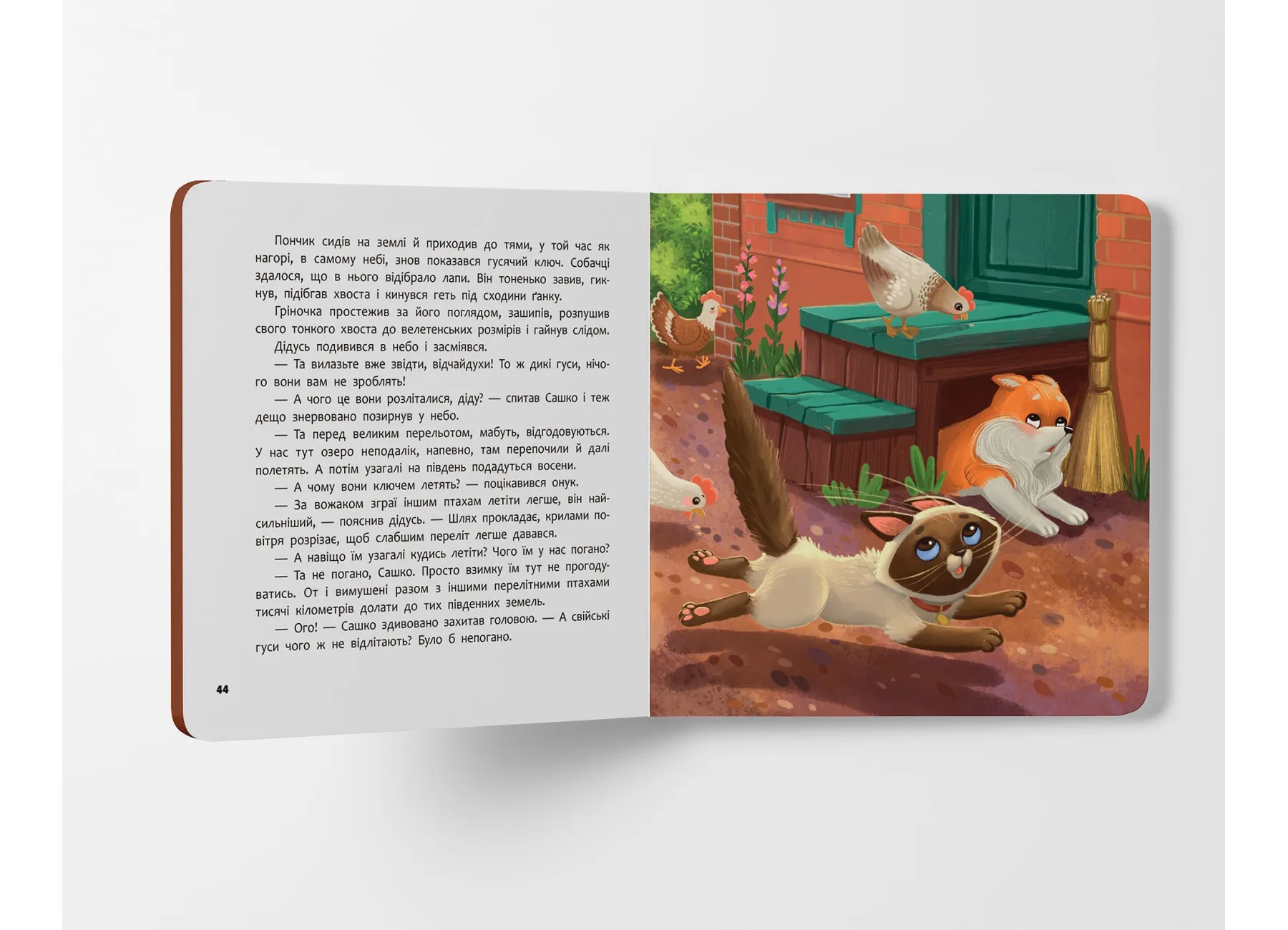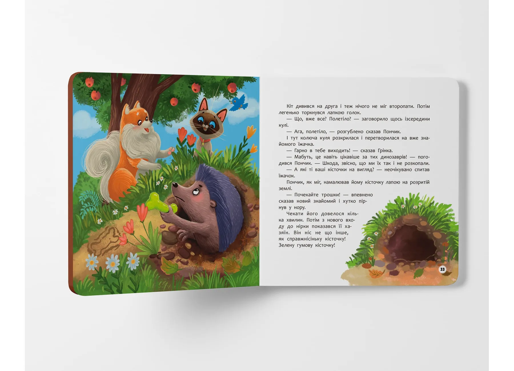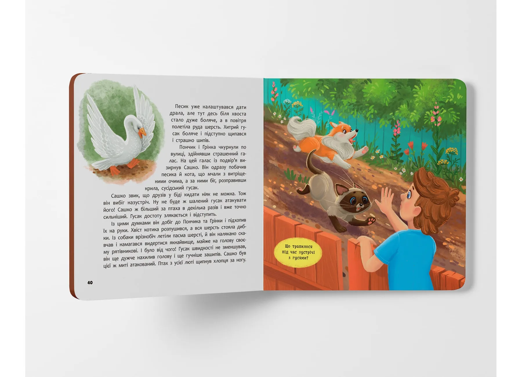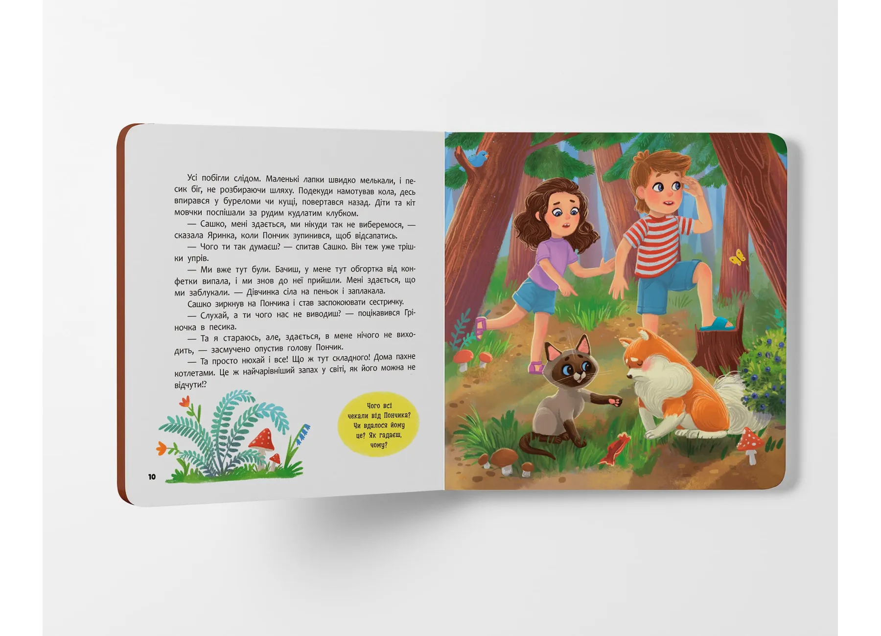 Ця весела та яскраво ілюстрована книжка познайомить маленьких читачів із добродушним песиком Пончиком і його веселим другом — кошеням Грінкою. Разом із цими кумедними героями діти вирушать у захопливі пригоди за місто, щоб дізнатися, чим може обернутися надмірна цікавість, чи справді собаки є родичами вовків і хто має найкращий нюх. Юні читачі з’ясують, чому Пончик вирішив перевтілитися на справжнього кота, як справжні друзі захищають одне одного від насмішок, чи залишилися динозаври у світі й чи може пес стати палеонтологом. А ще дізнаються, які скарби можна знайти в бабусиному городі, чим можна ощасливити когось навіть через роки, що люблять їсти їжаки та чи має гусак зуби.