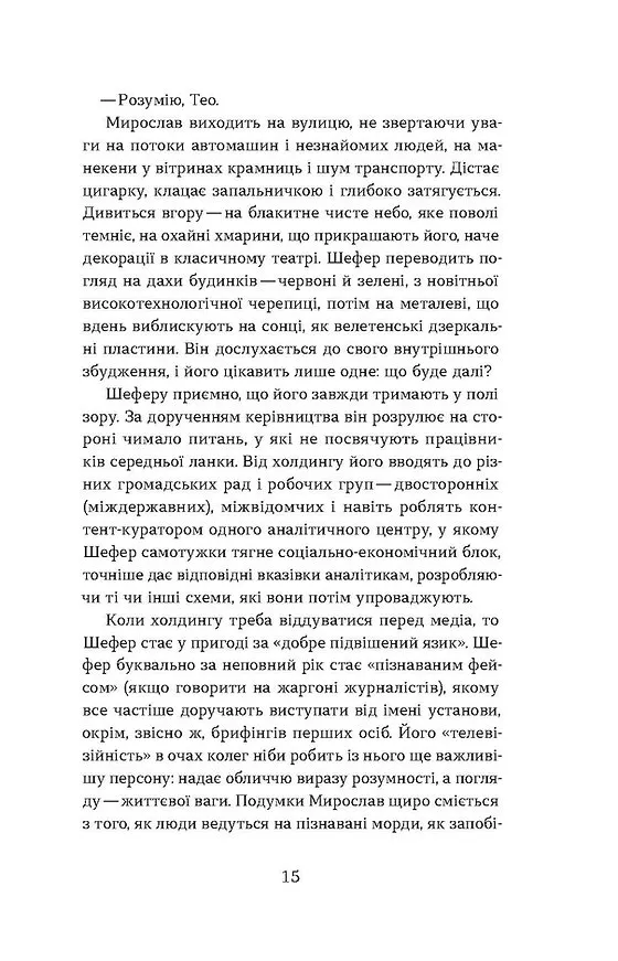 Мирослав Шефер — успішний аналітик-економіст, одержимий драматургією. Він живе подвійне життя: зранку — костюми, офіс, наради, ввечері — коктейлі, клуби та жінки, яких Мирослав використовує як «матеріал» для п’єс.