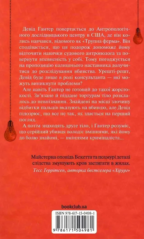 Девід Гантер повертається до Антропологічного дослідницького центру в США, де він колись навчався, відомого як «Трупна ферма». Він сподівається, що ця подорож допоможе йому відточити навички судового антрополога та повернути впевненість у собі. Тому погоджується на пропозицію колишнього наставника долучитися до розслідування вбивства. Урешті-решт, Девід буде лише в ролі консультанта - що може піти не так?Але навіть Гантер не готовий до такої жорстокості. Зв’язане й піддане тортурам тіло розклалось до невпізнання. Знайдені на місці злочину відбитки пальців вказують на вбивцю, але Девід підозрює, що все не так, як здається на перший погляд.А потім знаходять друге тіло, і Гантер розуміє, що серійний убивця володіє вміннями, які йому до болю знайомі, - вміннями криміналіста…