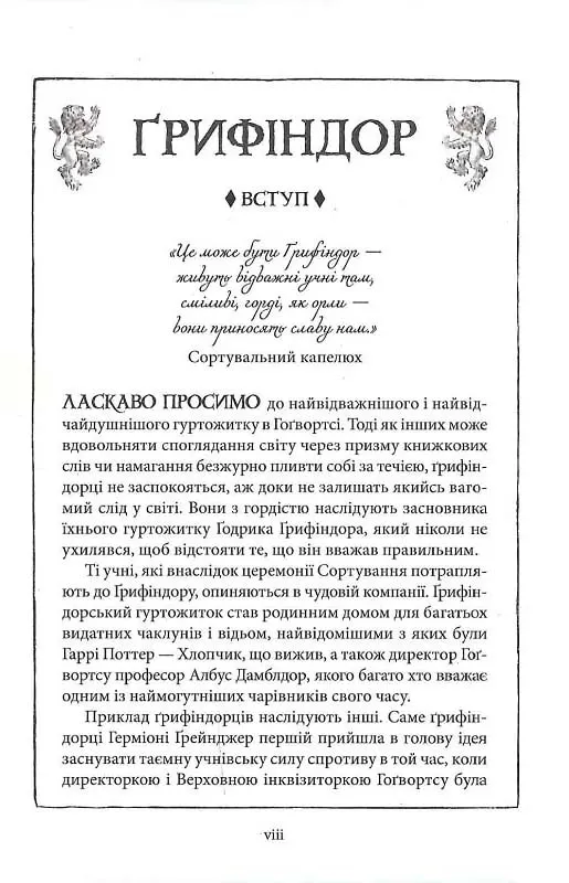 У перший рік навчання Гаррі у Гоґвортсі ми знайомимося з персонажами, без яких Ґрифіндор годі й уявити — вихователькою Мінервою Макґонеґел, привидом Майже- Безголовим Ніком, а Сортувальний Капелюх відправляє першокласників, включно з Герміоною Ґрейнджер, Роном Візлі та Гаррі Поттером, до славного гуртожитку, заснованого Ґодриком Ґрифіндором.