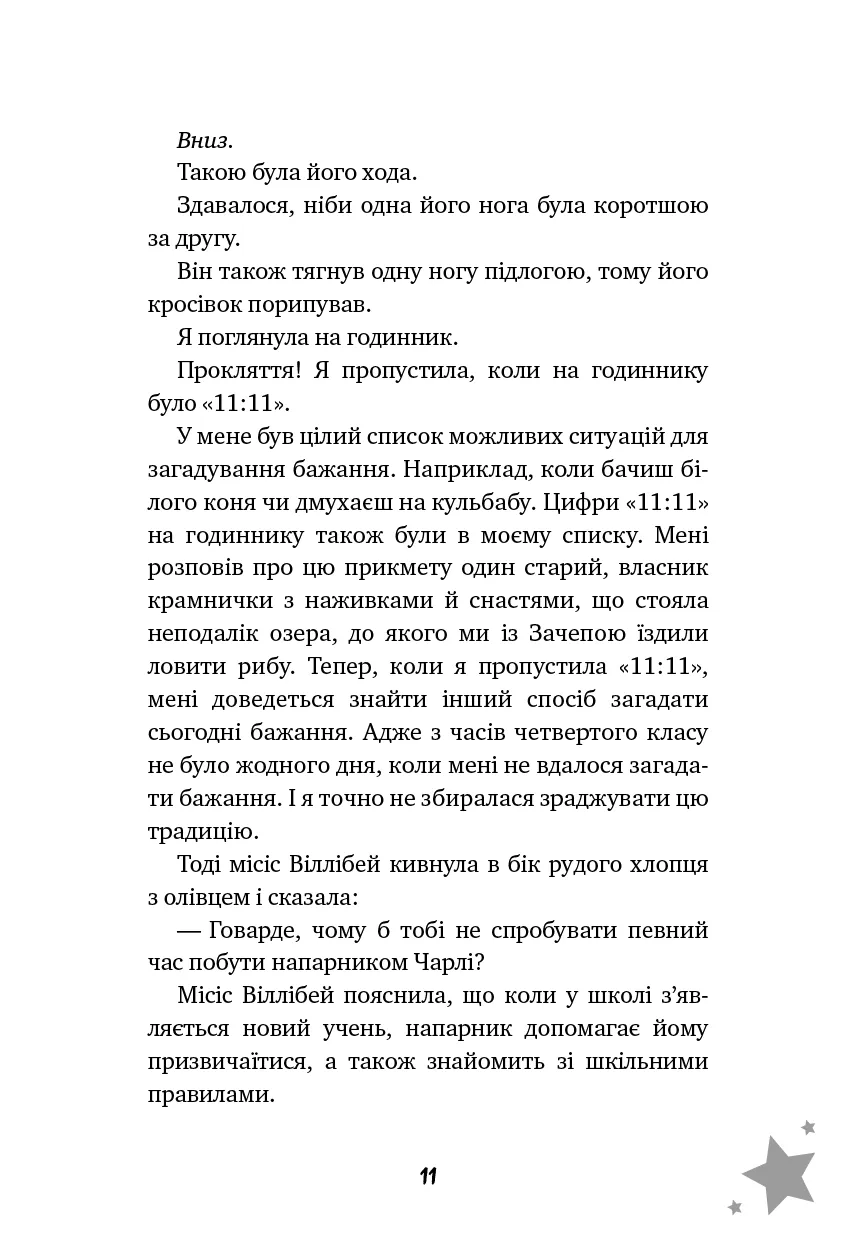 Роман «Бажання» від американської письменниці Барбари О'Коннор — це душевна історія, яка розкриває теми дружби, родини та пошуку справжнього щастя. Центральною героїнею книги є одинадцятирічна Чарлі Різ, яка щодня загадує одне й те саме бажання, використовуючи всі можливі способи, від першої зірки до останнього шматочка пирога.