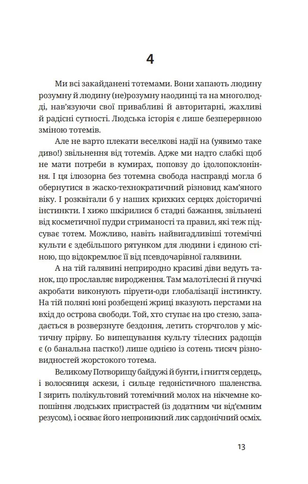 "Тотем" став соціально-психологічним портретом травмованої нації та окремої людини. Цей роман – своєрідне дзеркало кожного з нас, яке показує внутрішню незгоду, нерівність і пошук гармонії. Через майже 25 років після першої публікації він залишається актуальним й отримав нову редакцію у сучасному контексті.
