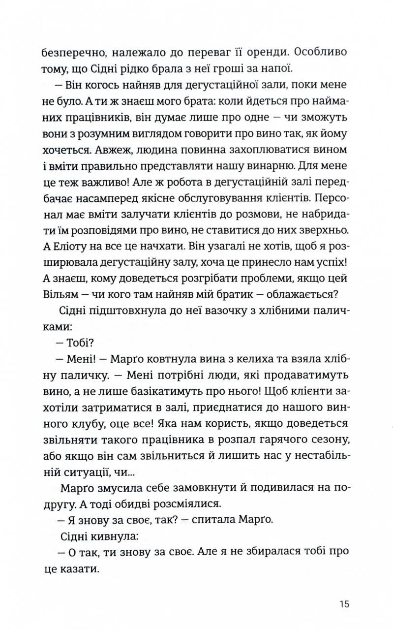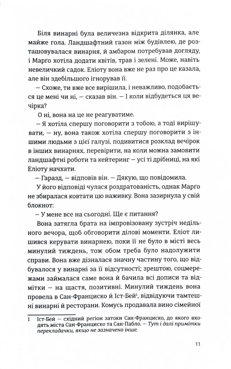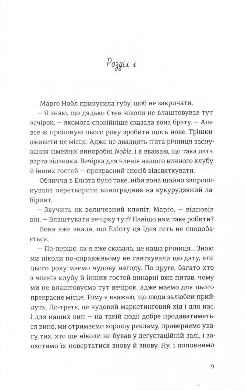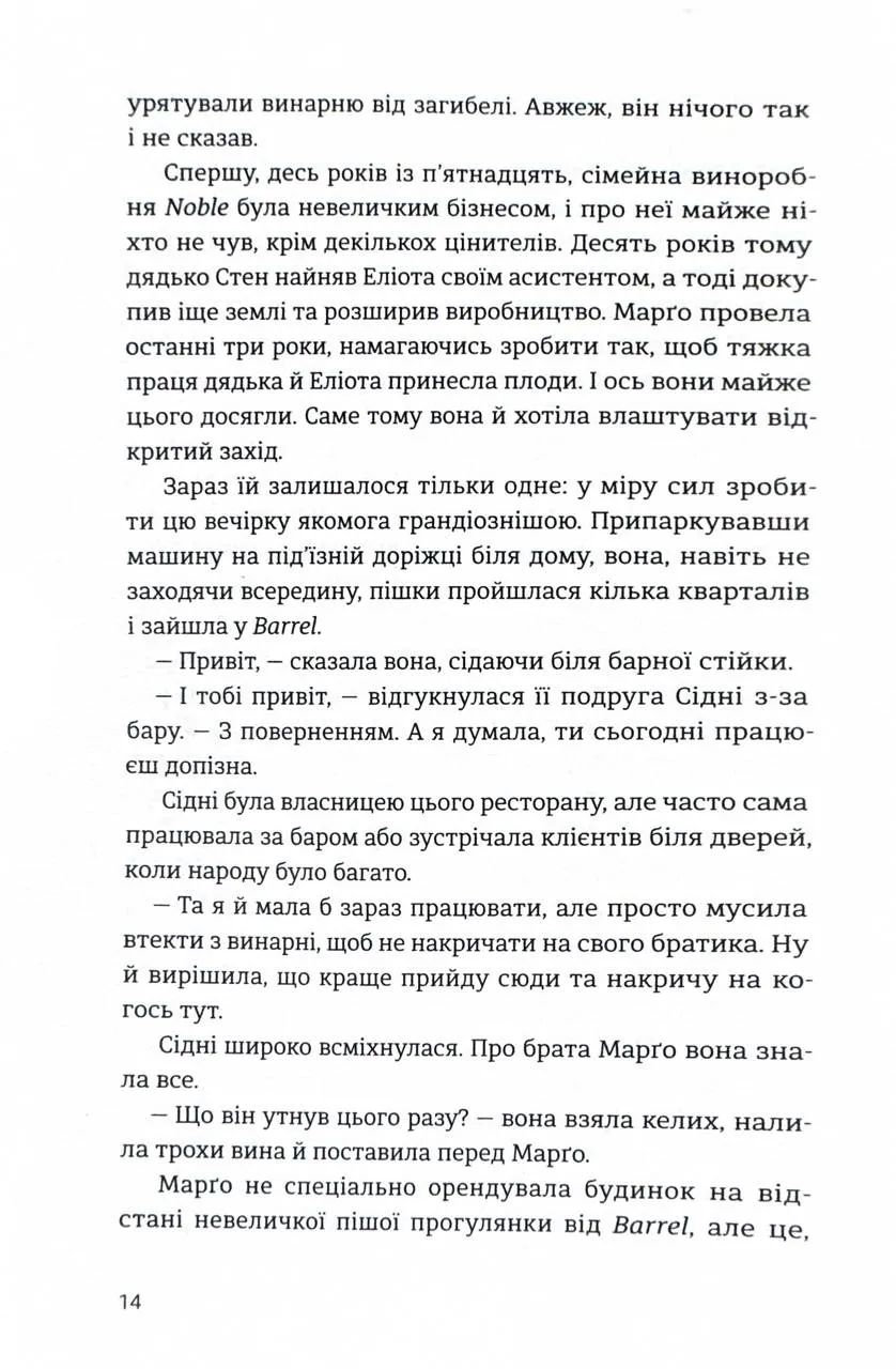 Головна героїня роману, Марґо Нобл, працює співвласницею сімейної винарні, яка розташована в мальовничій долині Напа. Її робота приносить як радість, так і стрес, і під час зайнятого графіка вона все більше відчуває потребу у відпочинку. Додайте до цього непрості стосунки із родиною, і зрозумієте, що Марґо потребує паузи.