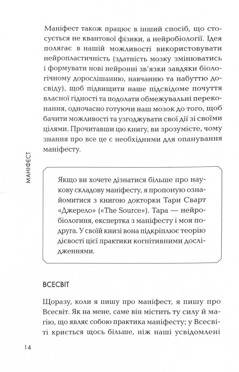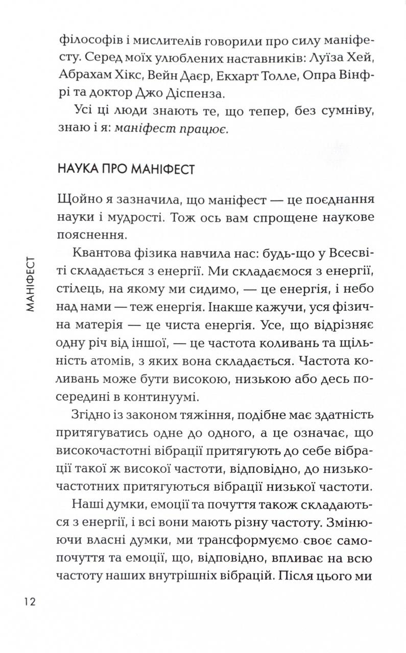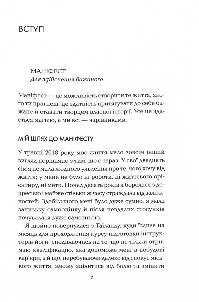 Якщо ви хочете знайти свою другу половинку, здобути роботу мрії або просто віднайти внутрішній спокій та впевненість у майбутньому, «Маніфест» допоможе вам цього досягнути. Достатньо семи простих кроків, завдяки яким ви зрозумієте мистецтво маніфестації: