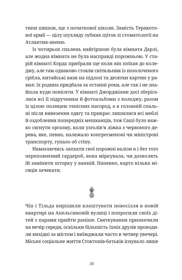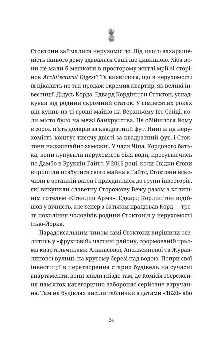 "Ананасова вулиця" — це літературний шедевр, що занурює читача у світ елітного Нью-Йорка. Авторка, Дженні Джексон, з неймовірною точністю описує життя сімей, для яких розкіш і соціальний статус відіграють визначальну роль.