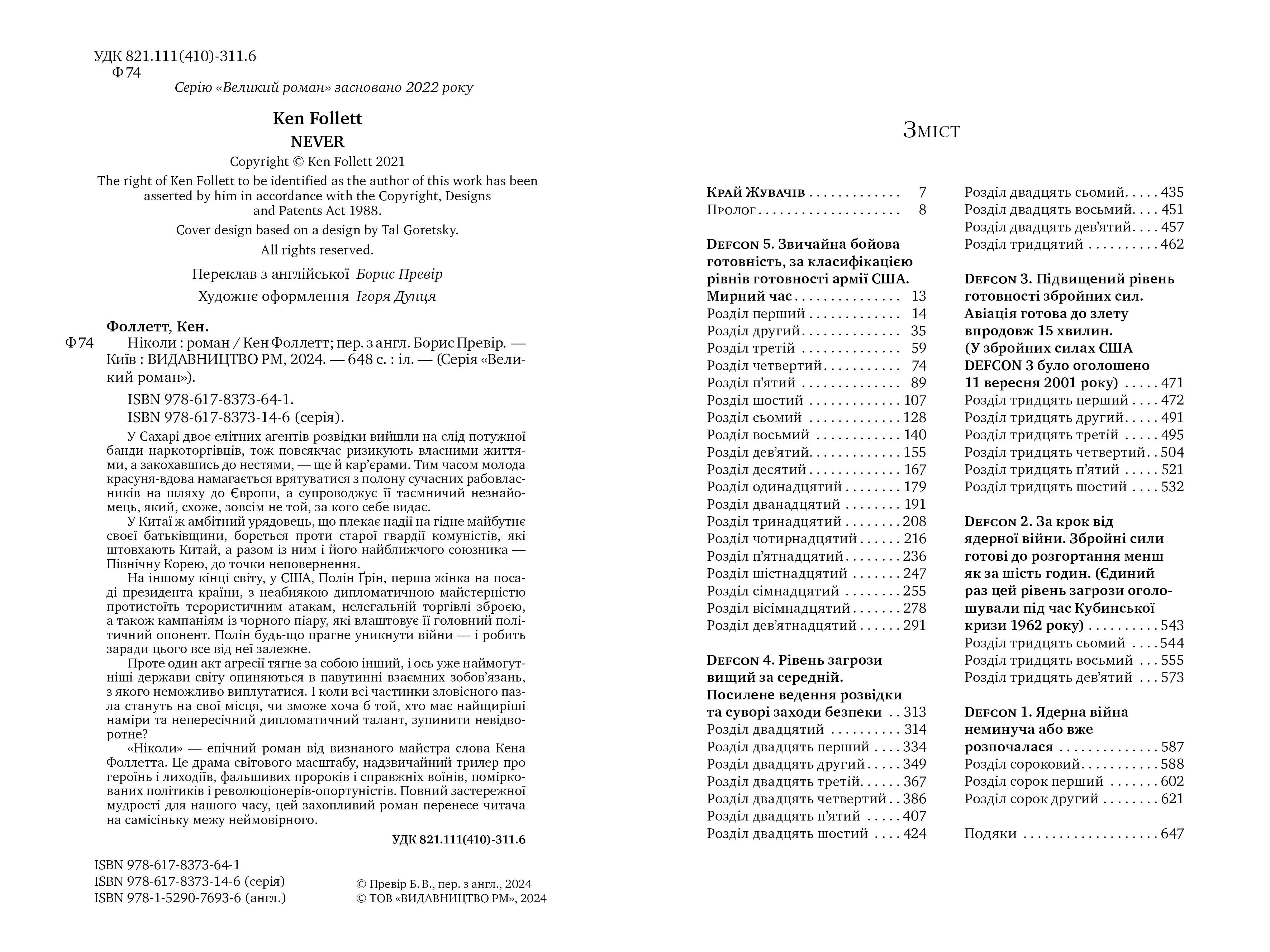 Роман "Ніколи" — це новий захопливий твір від Кена Фоллетта, одного з найвідоміших сучасних письменників. У ньому переплітаються інтриги, міжнародна політика, шпигунські змови та особисті драми головних героїв.