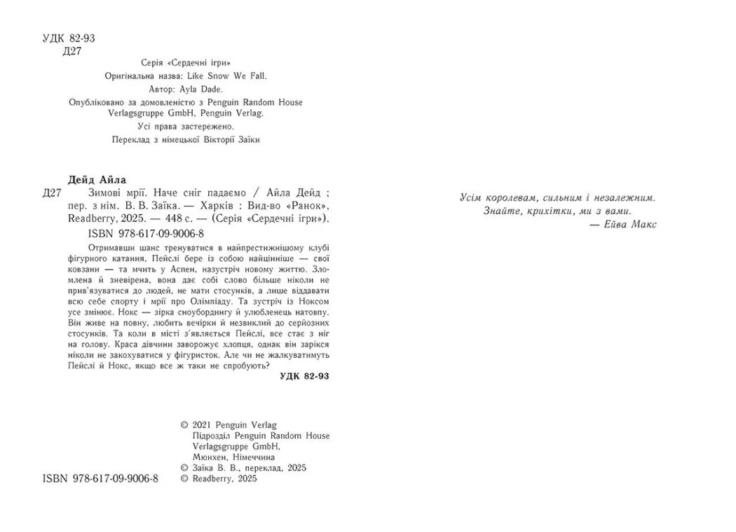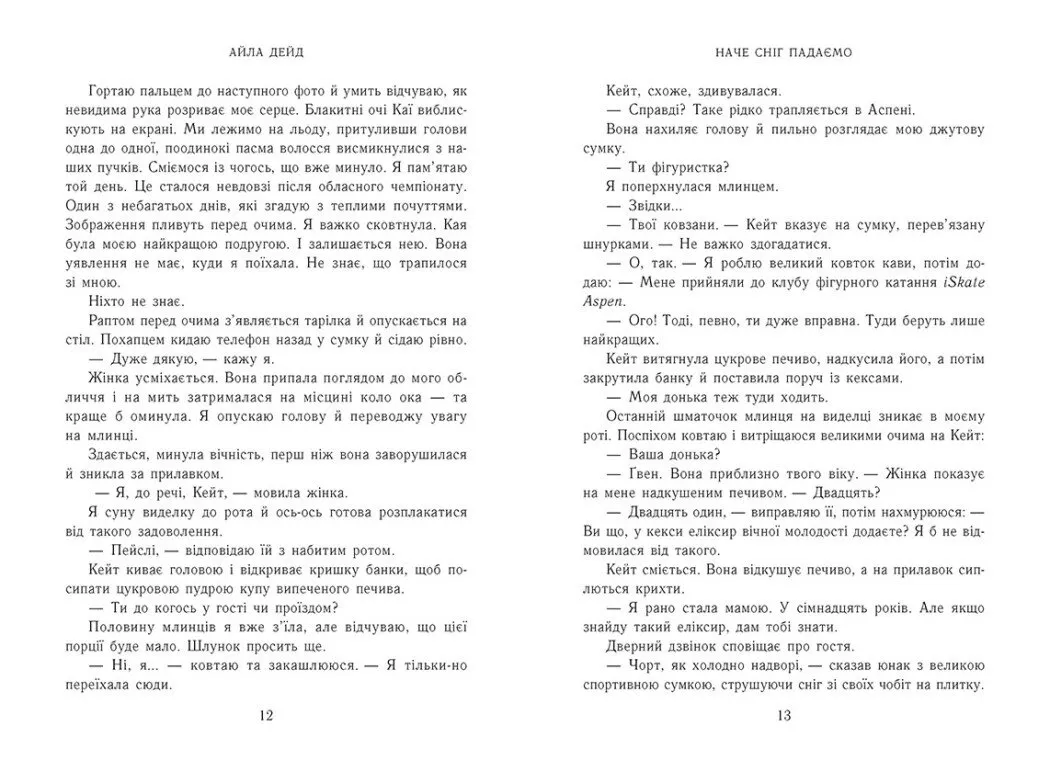Айла Дейд представляє захопливий роман «Наче сніг падаємо. Книга 1. Сердечні ігри», який переносить нас у світ спорту, напруги та романтики. Головна героїня, Пейслі, отримує шанс тренуватися в одному з найкращих клубів фігурного катання. Вона переїжджає в Аспен із єдиною мрією – досягти Олімпіади.
