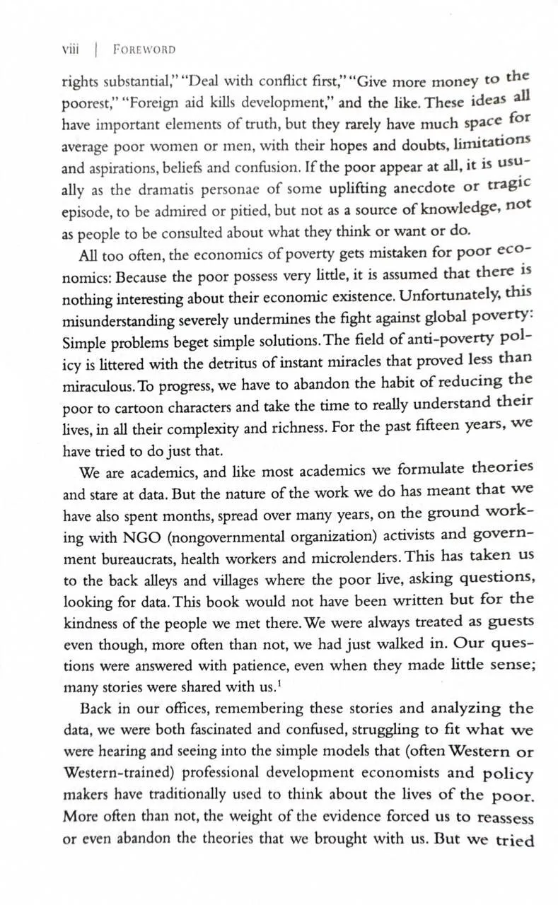 This eye-opening book overturns the myths about what it is like to live on very little, revealing the unexpected decisions that millions of people make every day. Looking at some of the most paradoxical aspects of life below the poverty line - why the poor need to borrow in order to save, why incentives that seem effective to us may not be for them, and why, despite being more risk-taking than high financiers, they start businesses but rarely grow them - Banerjee and Duflo offer a new understanding of the surprising way the world really works.