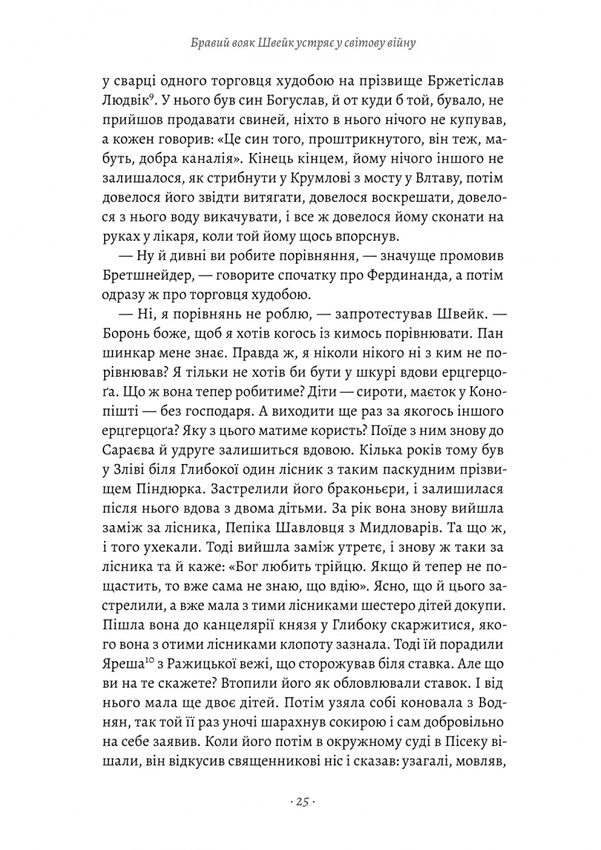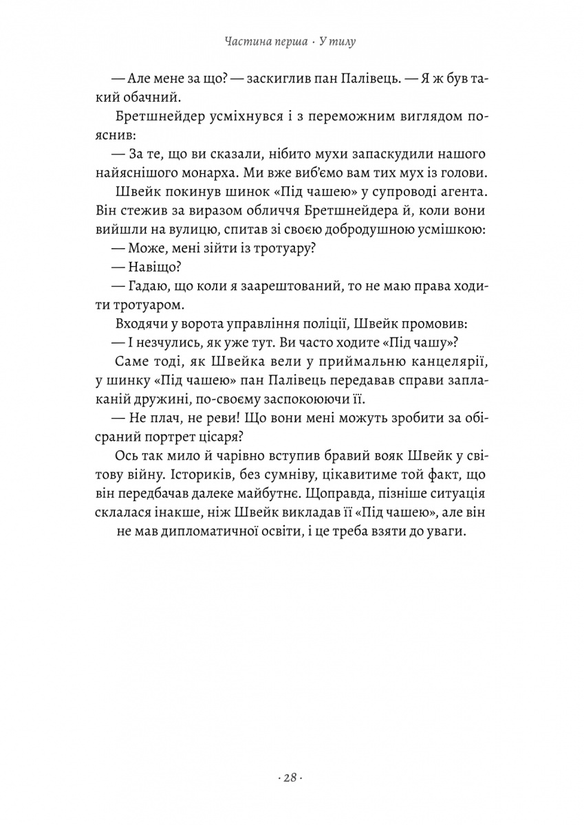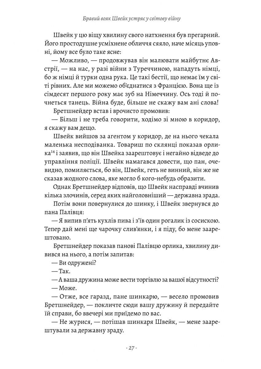 Всесвітньовідомий сатиричний роман чеського письменника Ярослава Гашека у блискучому перекладі українського поета, перекладача й учасника визвольних змагань Степана-Юрія Масляка. «Пригоди бравого вояка Швейка» — це життєва історія простої людини й водночас пронизлива сатира — протест проти війни та насилля в період Першої світової війни. Завдяки блискучій грі слів, описам численних пригод, анекдотам й реалістично зображеній буденності, роман, покликаний висміювати лицемірне обличчя імперськості, не втрачає своєї актуальності й в наш час.